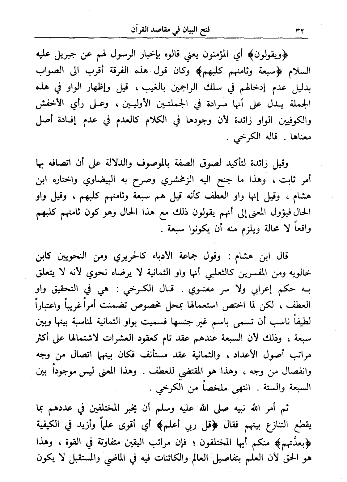 قال ابن هشام: وقول جماعة الأدباء كالحريري ومن النحوين كابن خالويه ومن المفسرين كالثعلبي أنها واو الثمانية لا يرضاه نحوي لأنه لا يتعلق به حكم إعرابي ولا سر معنوي. قال الكرخي: هي في التحقيق واو العطف، لكن لما اختص استعمالها بمحل مخصوص تضمنت أمراً غريباً واعتباراً لطيفاً ناسب أن تسمى باسم غير جنسها فسميت بواو الثمانية لمناسبة بينها وبين سبعة، وذلك لأن السبعة عندهم عند تام كعقود العشرات لاشتمالها على أكثر مراتب أصول الأعداد، والثمانية عند مستأنف فكان بينهما اتصال من وجه وانفصال من وجه، وهذا هو المقتضي للعطف. وهذا المعنى ليس موجوداً بين السبعة والستة. انتهى ملخصاً من الكرخي.