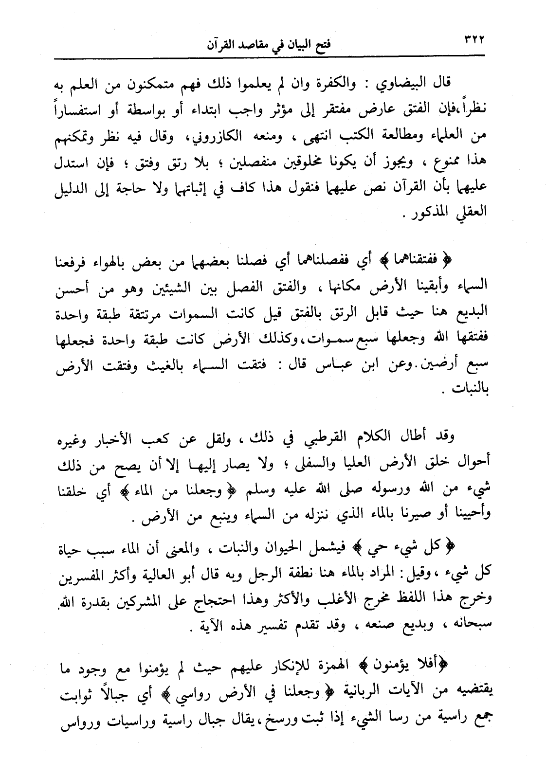 قال البيضاوي: والكفرة وإن لم يعلموا ذلك فهم متمكنون من العلم به نظراً، فإن الفتق عارض مفتقر إلى مؤثر واجب ابتداء أو بواسطة أو استفساراً من العلماء ومطالعة الكتب انتهى، ومنعه الكازروني، وقال فيه نظر وتمكنهم هذا ممنوع، ويجوز أن يكونا مخلوقين منفصلين؛ بلا رتق وفتق؛ فإن استدل عليهما بأن القرآن نص عليهما فنقول هذا كاف في إثباتهما ولا حاجة إلى الدليل العقلي المذكور.