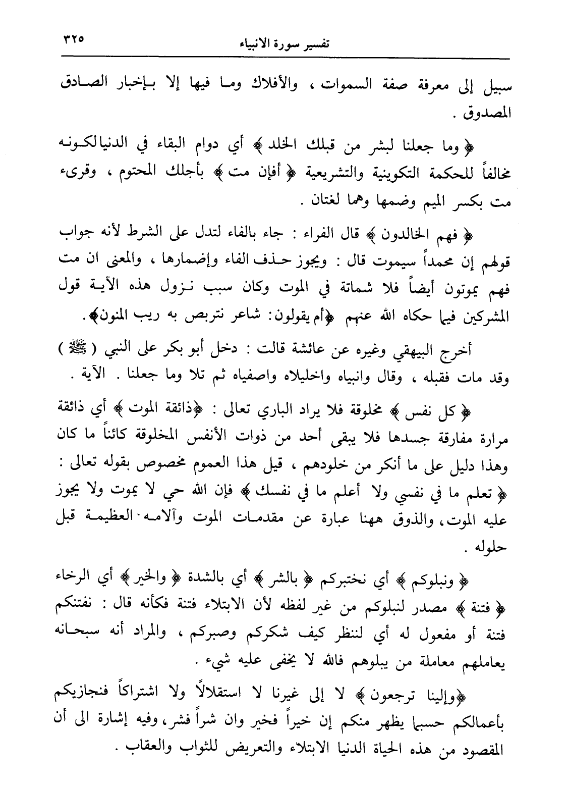 (ونبلوكم) أي نختبركم (بالشر) أي بالشدة (والخير) أي الرخاء (فتنة) مصدر لنبلوكم من غير لفظه لأن الابتلاء فتنة فكأنه قال: نفتنكم فتنة أو مفعول له أي لننظر كيف شكركم وصبركم، والمراد أنه سبحانه يعاملهم معاملة من يبلوهم فالله لا يخفى عليه شيء.