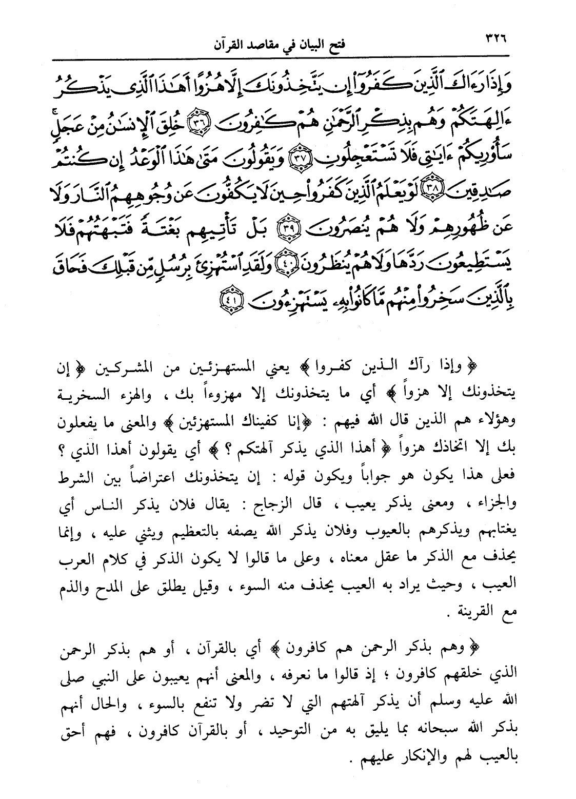 وَإِذَا رَآكَ الَّذِينَ كَفَرُوا إِنْ يَتَّخِذُونَكَ إِلَّا هُزُوًا أَهَذَا الَّذِي يَذْكُرُ آلِهَتَكُمْ وَهُمْ بِذِكْرِ الرَّحْمَنِ هُمْ كَافِرُونَ (36) خُلِقَ الْإِنْسَانُ مِنْ عَجَلٍ سَأُرِيكُمْ آيَاتِي فَلَا تَسْتَعْجِلُونِ (37) وَيَقُولُونَ مَتَى هَذَا الْوَعْدُ إِنْ كُنْتُمْ صَادِقِينَ (38) لَوْ يَعْلَمُ الَّذِينَ كَفَرُوا حِينَ لَا يَكُفُّونَ عَنْ وُجُوهِهِمُ النَّارَ وَلَا عَنْ ظُهُورِهِمْ وَلَا هُمْ يُنْصَرُونَ (39) بَلْ تَأْتِيهِمْ بَغْتَةً فَتَبْهَتُهُمْ فَلَا يَسْتَطِيعُونَ رَدَّهَا وَلَا هُمْ يُنْظَرُونَ (40) وَلَقَدِ اسْتُهْزِئَ بِرُسُلٍ مِنْ قَبْلِكَ فَحَاقَ بِالَّذِينَ سَخِرُوا مِنْهُمْ مَا كَانُوا بِهِ يَسْتَهْزِئُونَ (41)