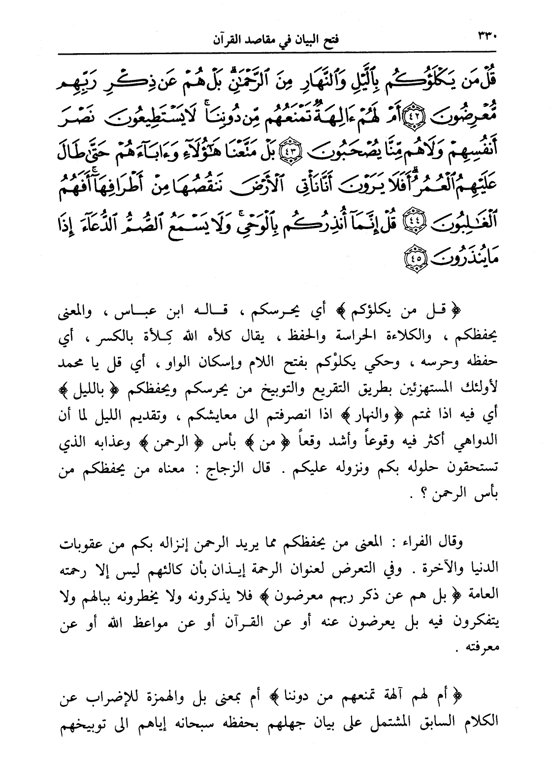 قُلْ مَنْ يَكْلَؤُكُمْ بِاللَّيْلِ وَالنَّهَارِ مِنَ الرَّحْمَنِ بَلْ هُمْ عَنْ ذِكْرِ رَبِّهِمْ مُعْرِضُونَ (42) أَمْ لَهُمْ آلِهَةٌ تَمْنَعُهُمْ مِنْ دُونِنَا لَا يَسْتَطِيعُونَ نَصْرَ أَنْفُسِهِمْ وَلَا هُمْ مِنَّا يُصْحَبُونَ (43) بَلْ مَتَّعْنَا هَؤُلَاءِ وَآبَاءَهُمْ حَتَّى طَالَ عَلَيْهِمُ الْعُمُرُ أَفَلَا يَرَوْنَ أَنَّا نَأْتِي الْأَرْضَ نَنْقُصُهَا مِنْ أَطْرَافِهَا أَفَهُمُ الْغَالِبُونَ (44) قُلْ إِنَّمَا أُنْذِرُكُمْ بِالْوَحْيِ وَلَا يَسْمَعُ الصُّمُّ الدُّعَاءَ إِذَا مَا يُنْذَرُونَ (45)