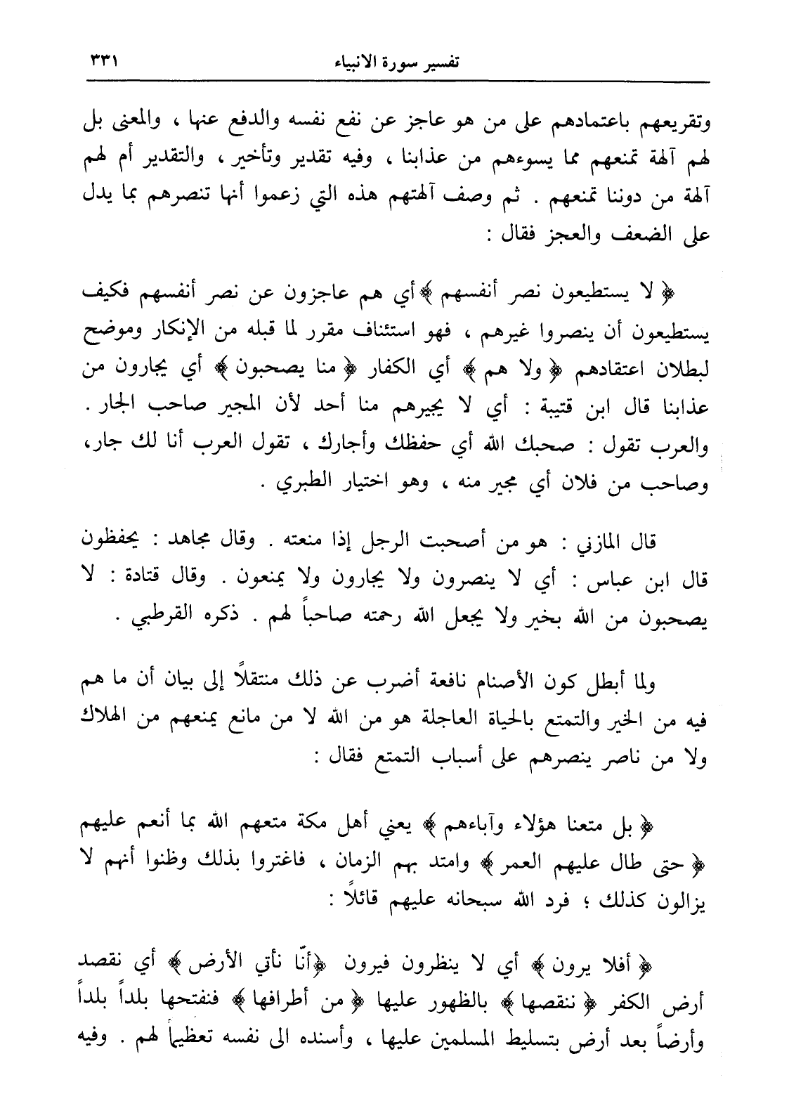 (لا يستطيعون نصر أنفسهم) أي هم عاجزون عن نصر أنفسهم فكيف يستطيعون أن ينصروا غيرهم، فهو استئناف مقرر لما قبله من الإنكار وموضح لبطلان اعتقادهم (ولا هم) أي الكفار (منا يصحبون) أي يجارون من عذابنا قال ابن قتيبة: أي لا يجيرهم منا أحد لأن المجير صاحب الجار. والعرب تقول: صحبك الله أي حفظك وأجارك، تقول العرب أنا لك جار، وصاحب من فلان أي مجير منه، وهو اختيار الطبري.