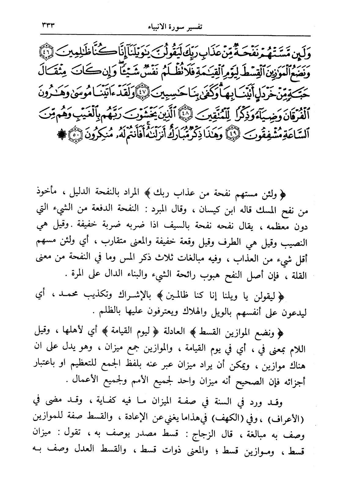 وَلَئِنْ مَسَّتْهُمْ نَفْحَةٌ مِنْ عَذَابِ رَبِّكَ لَيَقُولُنَّ يَا وَيْلَنَا إِنَّا كُنَّا ظَالِمِينَ (46) وَنَضَعُ الْمَوَازِينَ الْقِسْطَ لِيَوْمِ الْقِيَامَةِ فَلَا تُظْلَمُ نَفْسٌ شَيْئًا وَإِنْ كَانَ مِثْقَالَ حَبَّةٍ مِنْ خَرْدَلٍ أَتَيْنَا بِهَا وَكَفَى بِنَا حَاسِبِينَ (47) وَلَقَدْ آتَيْنَا مُوسَى وَهَارُونَ الْفُرْقَانَ وَضِيَاءً وَذِكْرًا لِلْمُتَّقِينَ (48) الَّذِينَ يَخْشَوْنَ رَبَّهُمْ بِالْغَيْبِ وَهُمْ مِنَ السَّاعَةِ مُشْفِقُونَ (49) وَهَذَا ذِكْرٌ مُبَارَكٌ أَنْزَلْنَاهُ أَفَأَنْتُمْ لَهُ مُنْكِرُونَ (50)