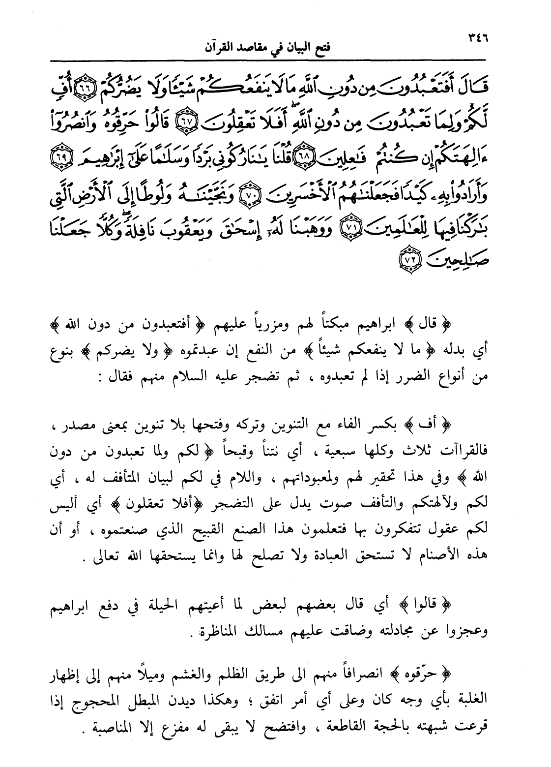 قَالَ أَفَتَعْبُدُونَ مِنْ دُونِ اللَّهِ مَا لَا يَنْفَعُكُمْ شَيْئًا وَلَا يَضُرُّكُمْ (66) أُفٍّ لَكُمْ وَلِمَا تَعْبُدُونَ مِنْ دُونِ اللَّهِ أَفَلَا تَعْقِلُونَ (67) قَالُوا حَرِّقُوهُ وَانْصُرُوا آلِهَتَكُمْ إِنْ كُنْتُمْ فَاعِلِينَ (68) قُلْنَا يَا نَارُ كُونِي بَرْدًا وَسَلَامًا عَلَى إِبْرَاهِيمَ (69) وَأَرَادُوا بِهِ كَيْدًا فَجَعَلْنَاهُمُ الْأَخْسَرِينَ (70) وَنَجَّيْنَاهُ وَلُوطًا إِلَى الْأَرْضِ الَّتِي بَارَكْنَا فِيهَا لِلْعَالَمِينَ (71) وَوَهَبْنَا لَهُ إِسْحَاقَ وَيَعْقُوبَ نَافِلَةً وَكُلاًّ جَعَلْنَا صَالِحِينَ (72)