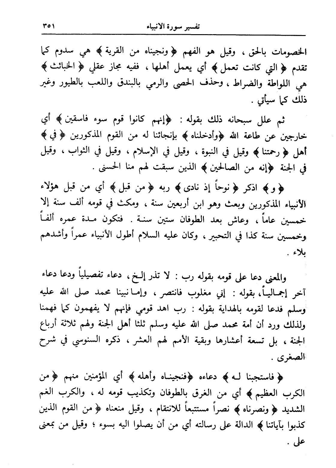 الخصومات بالحق، وقيل هو الفهم (ونجيناه من القرية) هي سدوم كما تقدم (التي كانت تعمل) أي يعمل أهلها، ففيه مجاز عقلي (الخبائث) هي اللواطة والضراط، وحذف الحصى والرمي بالبندق واللعب بالطيور وغير ذلك كما سيأتي.