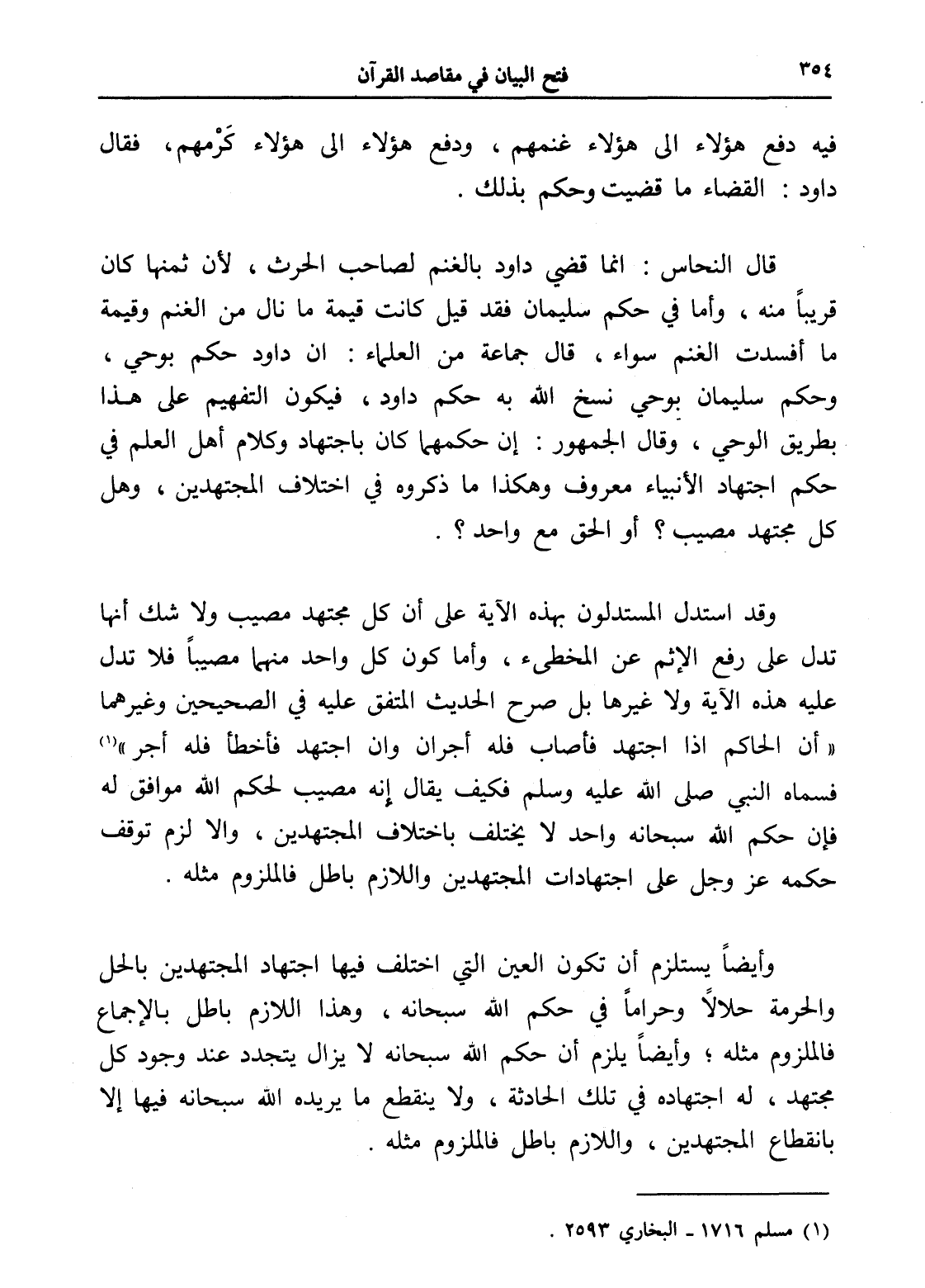 وقد استدل المستدلون بهذه الآية على أن كل مجتهد مصيب ولا شك أنها تدل على رفع الإثم عن المخطئ، وأما كون كل واحد منهما مصيباً فلا تدل عليه هذه الآية ولا غيرها بل صرح الحديث المتفق عليه في الصحيحين وغيرهما " أن الحاكم إذا اجتهد فأصاب فله أجران وإن اجتهد فأخطأ فله أجر " (¬1) فسماه النبي صلى الله عليه وسلم فكيف يقال أنه مصيب لحكم الله موافق له فإن حكم الله سبحانه واحد لا يختلف باختلاف المجتهدين، وإلا لزم توقف حكمه عز وجل على اجتهادات المجتهدين واللازم باطل فالملزوم مثله.