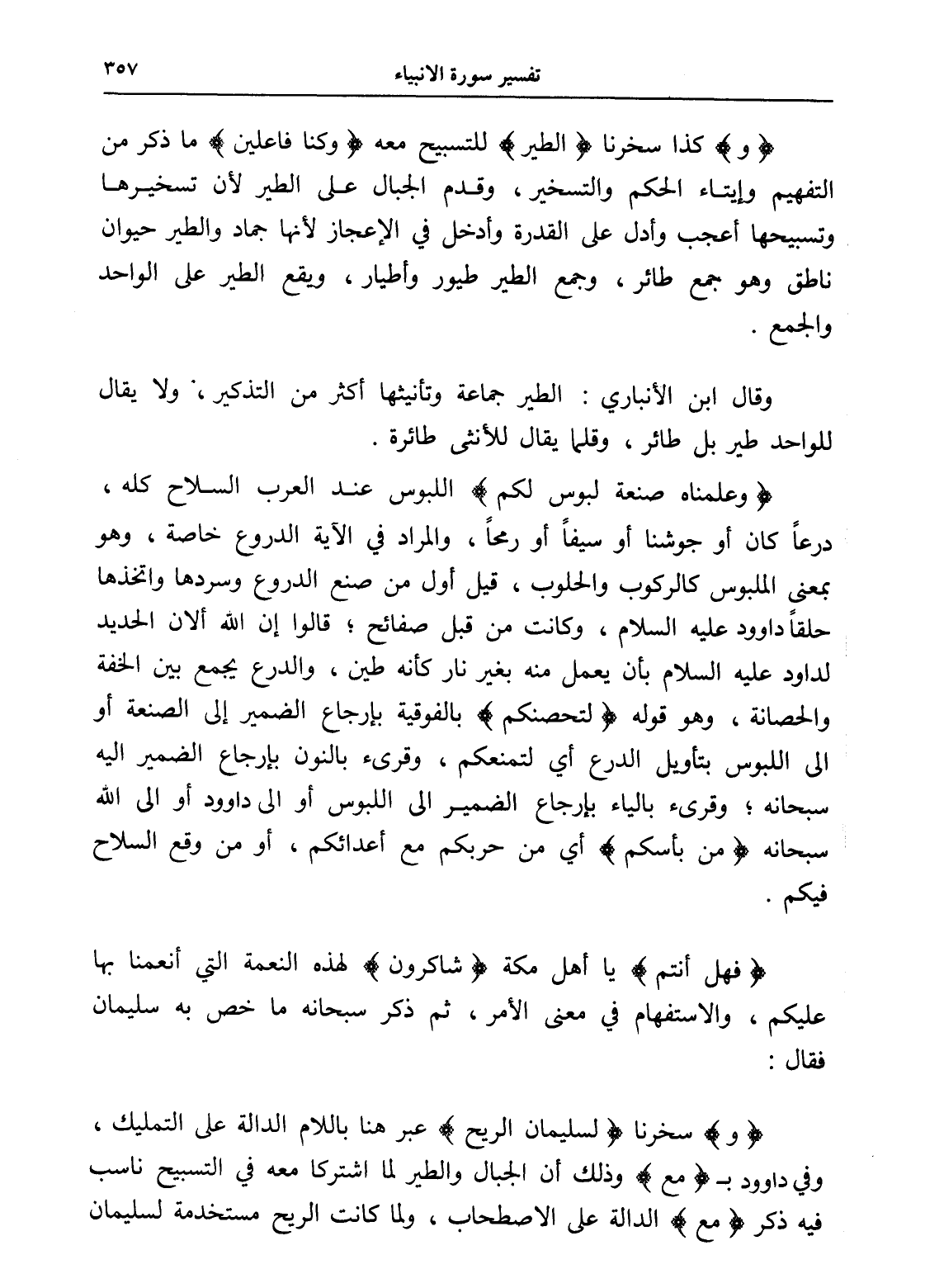 (وعلمناه صنعة لبوس لكم) اللبوس عند العرب السلاح كله، درعاً كان أو جوشنا أو سيفاً أو رمحاً، والمراد في الآية الدروع خاصة، وهو بمعنى الملبوس كالركوب والحلوب، قيل أول من صنع الدروع وسردها واتخذها حلقاً داوود عليه السلام، وكانت من قبل صفائح؛ قالوا إن الله ألان الحديد لداود عليه السلام بأن يعمل منه بغير نار كأنه طين، والدرع يجمع بين الخفة والحصانة، وهو قوله (لتحصنكم) بالفوقية بإرجاع الضمير إلى الصنعة أو إلى اللبوس بتأويل الدرع أي لشمنعكم، وقرئ بالنون بإرجاع الضمير إليه سبحانه؛ وقرئ بالياء بإرجاع الضمير إلى اللبوس أو إلى داوود أو إلى الله سبحانه (من بأسكم) أي من حربكم مع أعدائكم، أو من وقع السلاح فيكم.
