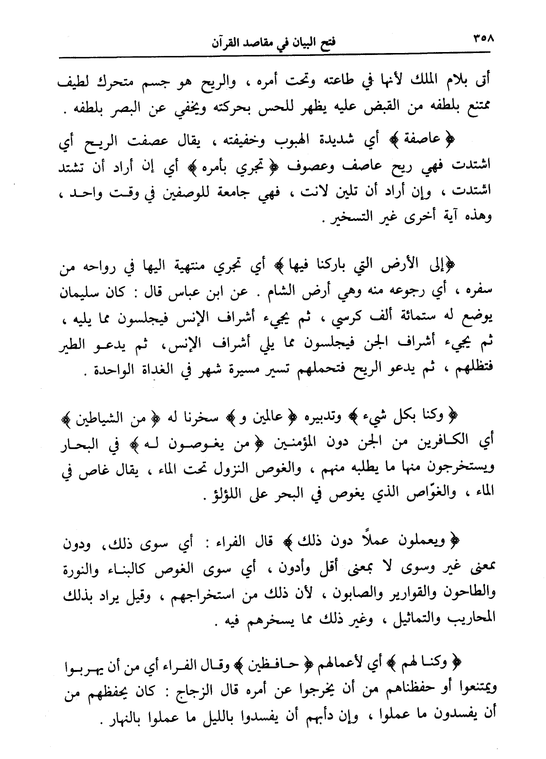 (إلى الأرض التي باركنا فيها) أي تجري منتهية إليها في رواحه من سفره، أي رجوعه منه وهي أرض الشام. عن ابن عباس قال: كان سليمان يوضع له ستمائة ألف كرسي، ثم يجيء أشراف الإنس فيجلسون مما يليه، ثم يجيء أشراف الجن فيجلسون مما يلي أشراف الإنس، ثم يدعو الطير فتظلهم، ثم يدعو الريح فتحملهم تسير مسيرة شهر في الغداة الواحدة.