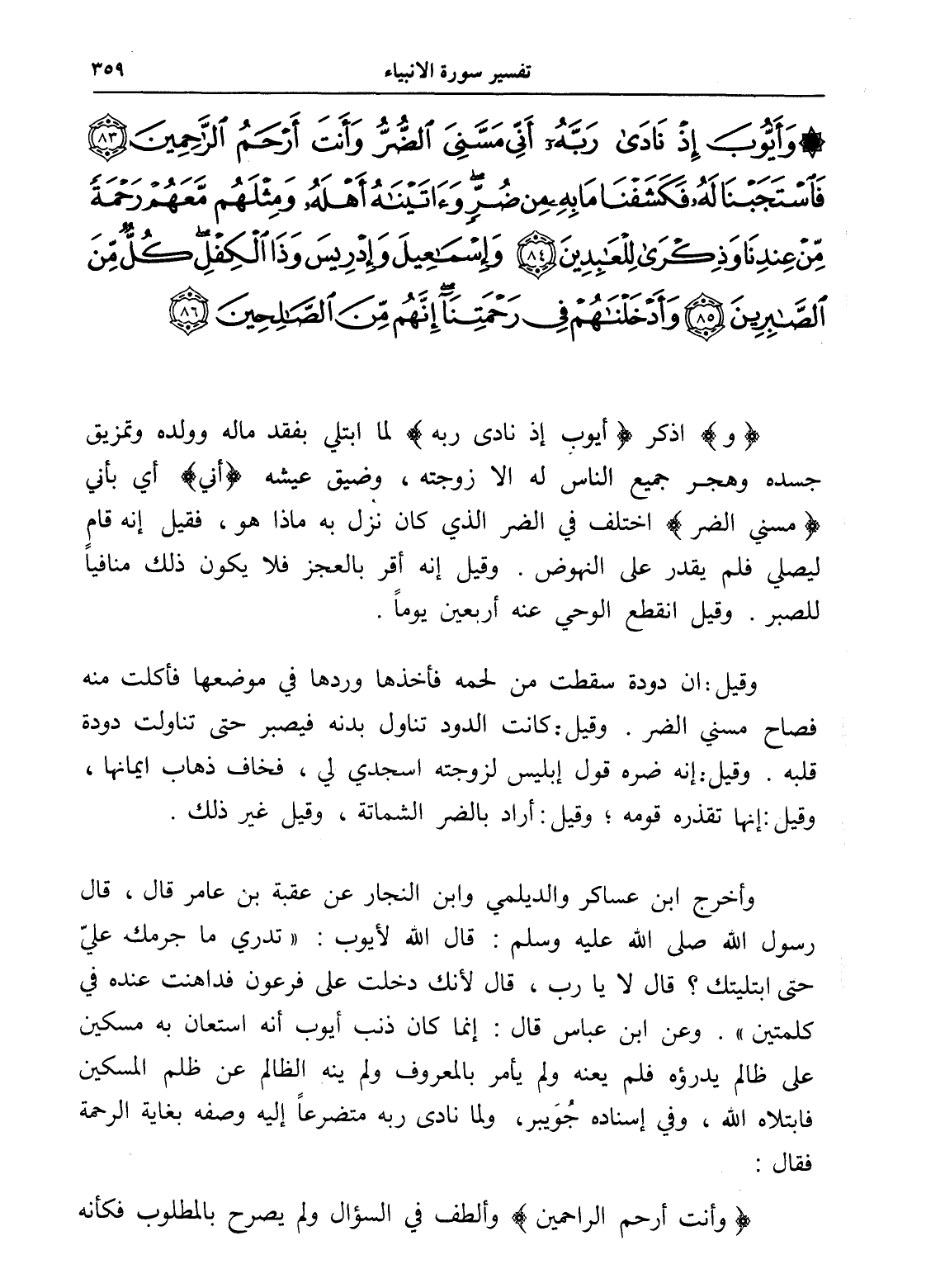 وَأَيُّوبَ إِذْ نَادَى رَبَّهُ أَنِّي مَسَّنِيَ الضُّرُّ وَأَنْتَ أَرْحَمُ الرَّاحِمِينَ (83) فَاسْتَجَبْنَا لَهُ فَكَشَفْنَا مَا بِهِ مِنْ ضُرٍّ وَآتَيْنَاهُ أَهْلَهُ وَمِثْلَهُمْ مَعَهُمْ رَحْمَةً مِنْ عِنْدِنَا وَذِكْرَى لِلْعَابِدِينَ (84) وَإِسْمَاعِيلَ وَإِدْرِيسَ وَذَا الْكِفْلِ كُلٌّ مِنَ الصَّابِرِينَ (85) وَأَدْخَلْنَاهُمْ فِي رَحْمَتِنَا إِنَّهُمْ مِنَ الصَّالِحِينَ (86)