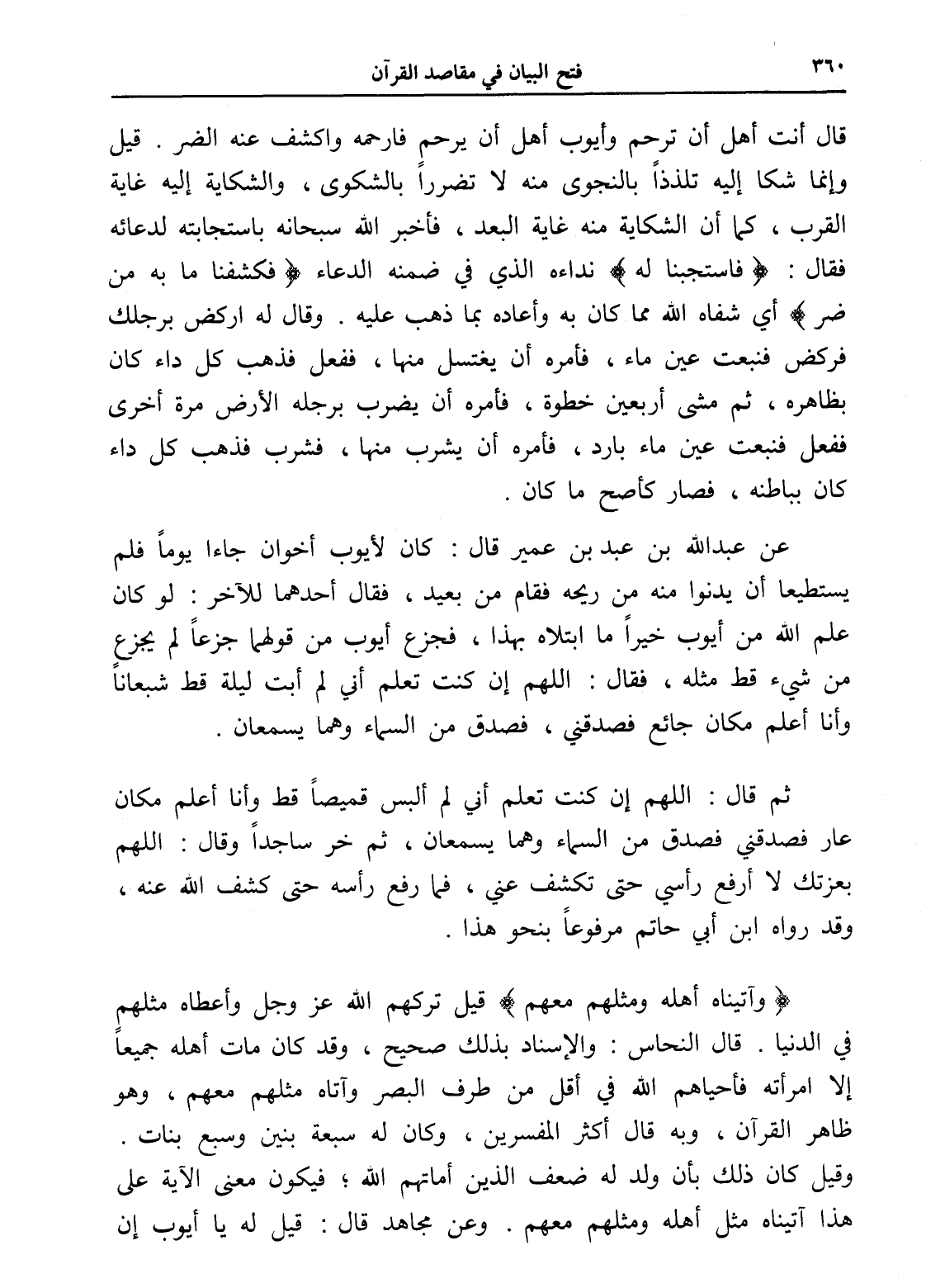 (فاستجبنا له) نداءه الذي في ضمنه الدعاء (فكشفنا ما به من ضر) أي شفاه الله مما كان به وأعاده بما ذهب عليه. وقال له اركض برجلك فركض فنبعت عين ماء، فأمره أن يغتسل منها، ففعل فذهب كل داء كان بظاهره، ثم مشى أربعين خطوة، فأمره أن يضرب برجله الأرض مرة أخرى ففعل فنبعت عين ماء بارد، فأمره أن يشرب منها، فشرب فذهب كل داء كان بباطنه، فصار كأصح ما كان.