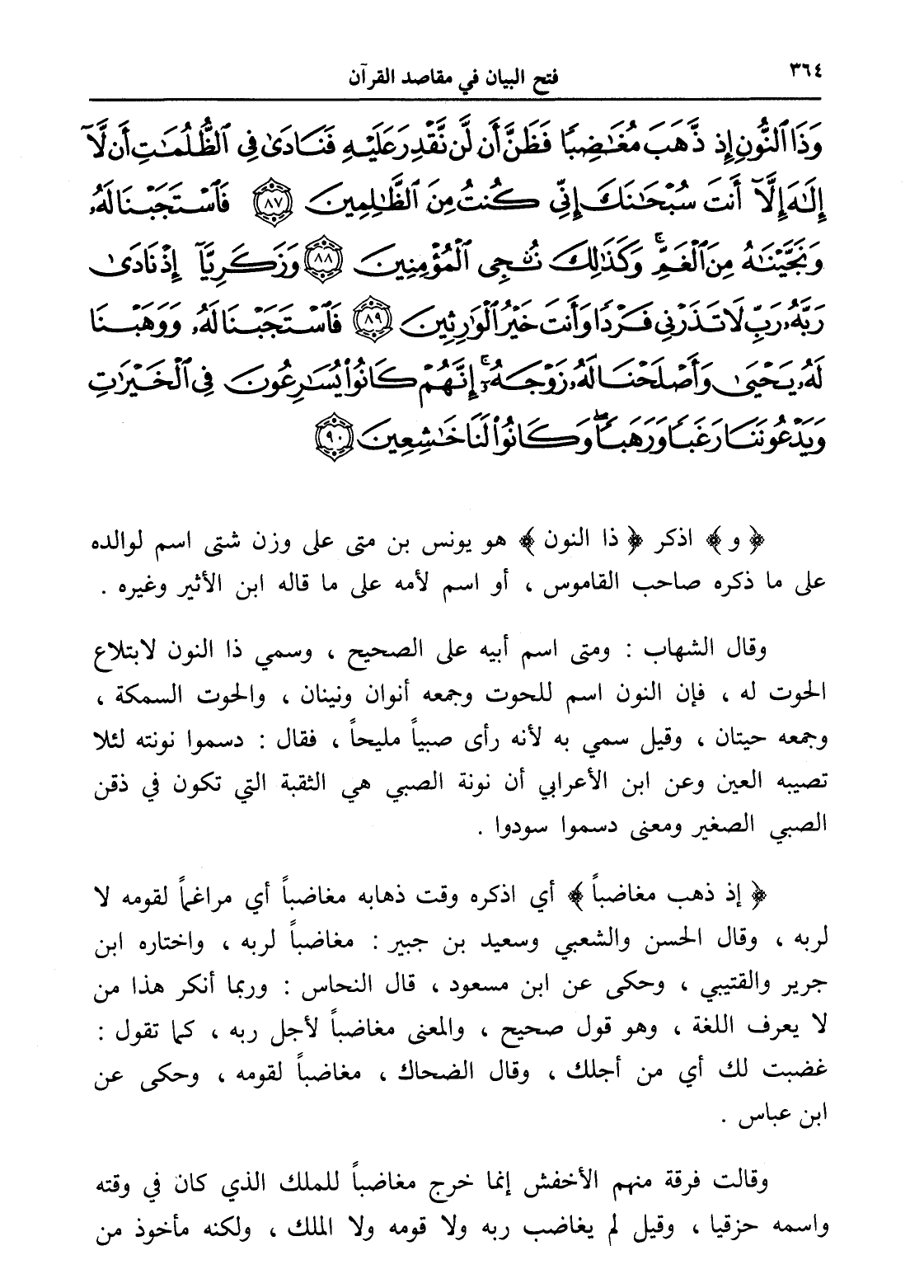 وَذَا النُّونِ إِذْ ذَهَبَ مُغَاضِبًا فَظَنَّ أَنْ لَنْ نَقْدِرَ عَلَيْهِ فَنَادَى فِي الظُّلُمَاتِ أَنْ لَا إِلَهَ إِلَّا أَنْتَ سُبْحَانَكَ إِنِّي كُنْتُ مِنَ الظَّالِمِينَ (87) فَاسْتَجَبْنَا لَهُ وَنَجَّيْنَاهُ مِنَ الْغَمِّ وَكَذَلِكَ نُنْجِي الْمُؤْمِنِينَ (88) وَزَكَرِيَّا إِذْ نَادَى رَبَّهُ رَبِّ لَا تَذَرْنِي فَرْدًا وَأَنْتَ خَيْرُ الْوَارِثِينَ (89) فَاسْتَجَبْنَا لَهُ وَوَهَبْنَا لَهُ يَحْيَى وَأَصْلَحْنَا لَهُ زَوْجَهُ إِنَّهُمْ كَانُوا يُسَارِعُونَ فِي الْخَيْرَاتِ وَيَدْعُونَنَا رَغَبًا وَرَهَبًا وَكَانُوا لَنَا خَاشِعِينَ (90)