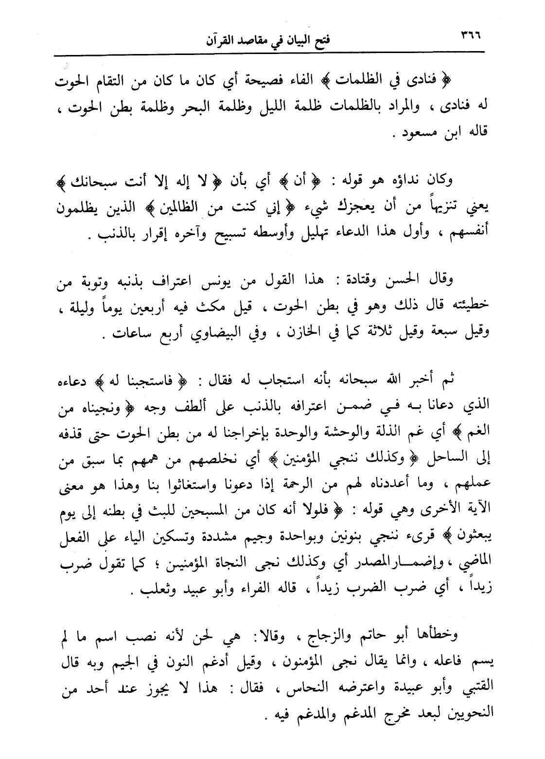 (فنادى في الظلمات) الفاء فصيحة أي كان ما كان من التقام الحوت له فنادى، والمراد بالظلمات ظلمة الليل وظلمة البحر وظلمة بطن الحوت، قاله ابن مسعود.