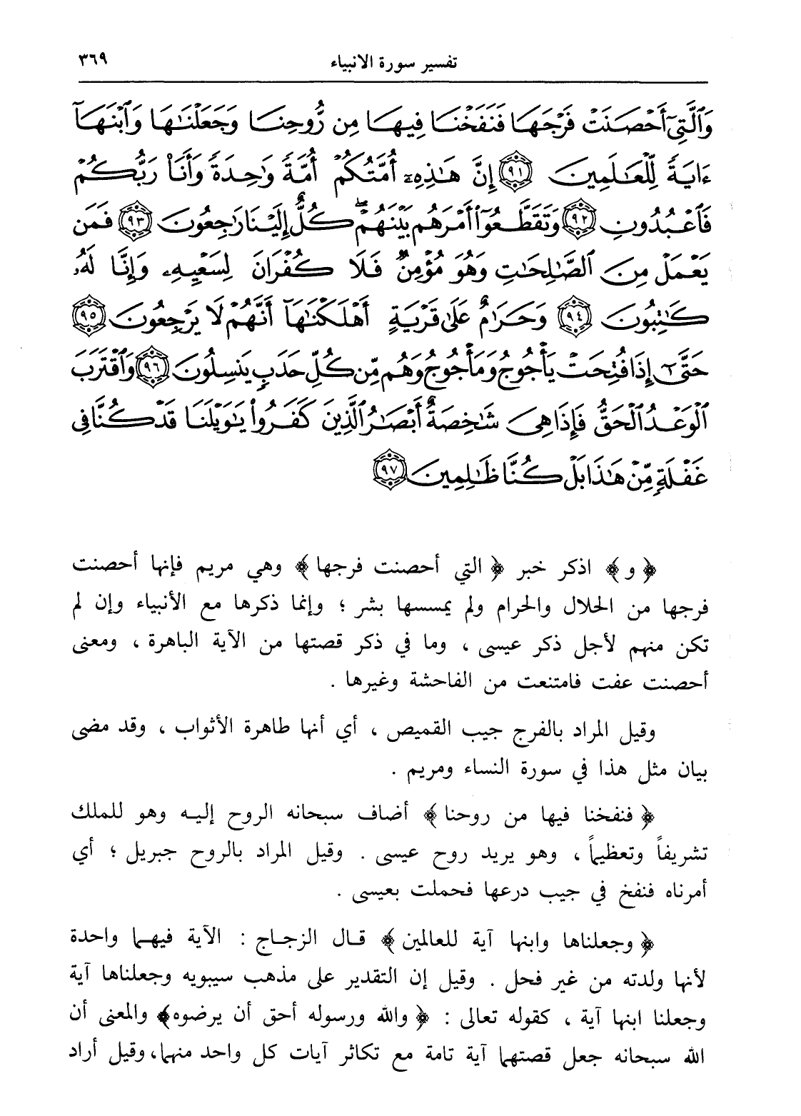 وَالَّتِي أَحْصَنَتْ فَرْجَهَا فَنَفَخْنَا فِيهَا مِنْ رُوحِنَا وَجَعَلْنَاهَا وَابْنَهَا آيَةً لِلْعَالَمِينَ (91) إِنَّ هَذِهِ أُمَّتُكُمْ أُمَّةً وَاحِدَةً وَأَنَا رَبُّكُمْ فَاعْبُدُونِ (92) وَتَقَطَّعُوا أَمْرَهُمْ بَيْنَهُمْ كُلٌّ إِلَيْنَا رَاجِعُونَ (93) فَمَنْ يَعْمَلْ مِنَ الصَّالِحَاتِ وَهُوَ مُؤْمِنٌ فَلَا كُفْرَانَ لِسَعْيِهِ وَإِنَّا لَهُ كَاتِبُونَ (94) وَحَرَامٌ عَلَى قَرْيَةٍ أَهْلَكْنَاهَا أَنَّهُمْ لَا يَرْجِعُونَ (95) حَتَّى إِذَا فُتِحَتْ يَأْجُوجُ وَمَأْجُوجُ وَهُمْ مِنْ كُلِّ حَدَبٍ يَنْسِلُونَ (96) وَاقْتَرَبَ الْوَعْدُ الْحَقُّ فَإِذَا هِيَ شَاخِصَةٌ أَبْصَارُ الَّذِينَ كَفَرُوا يَا وَيْلَنَا قَدْ كُنَّا فِي غَفْلَةٍ مِنْ هَذَا بَلْ كُنَّا ظَالِمِينَ (97)