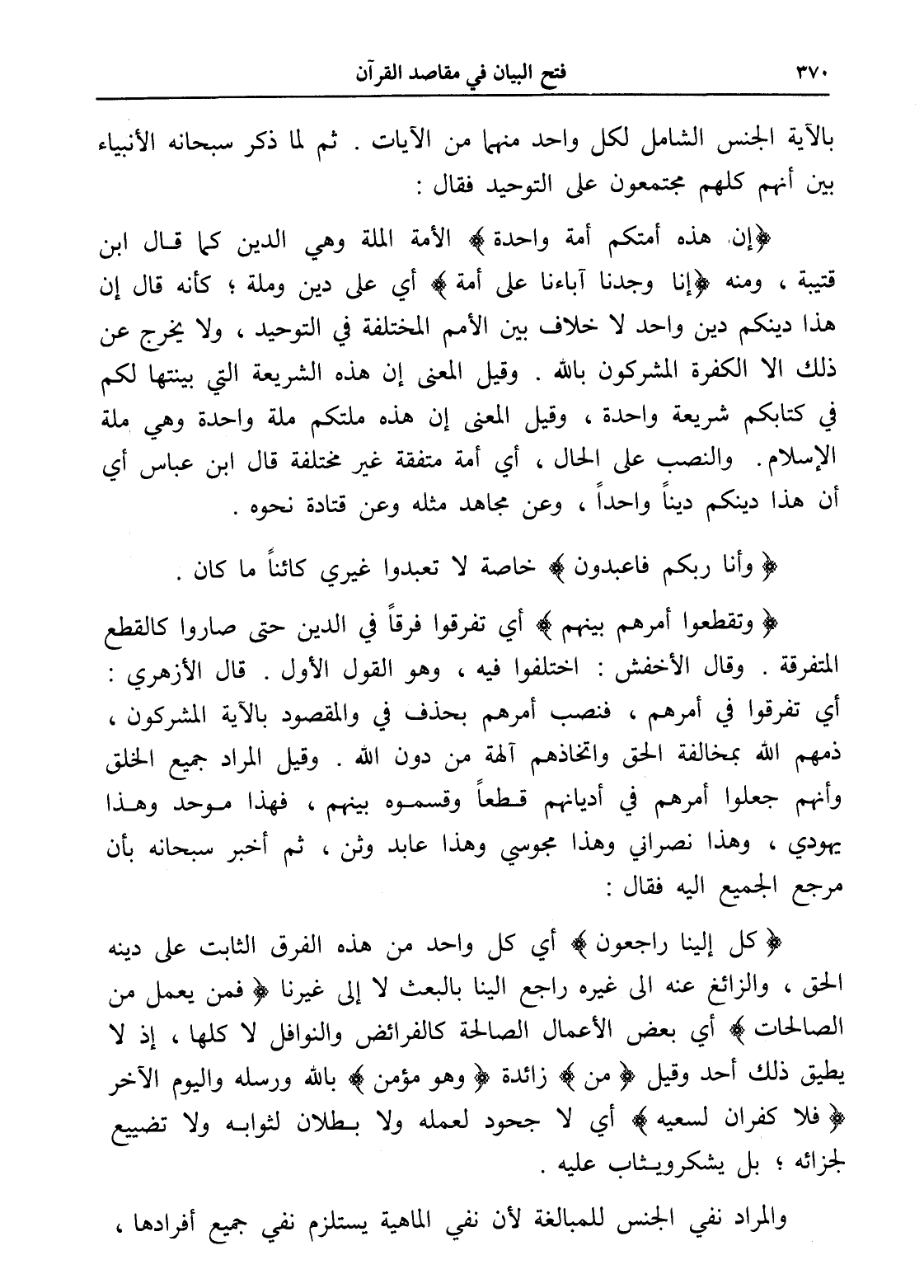 (إن هذه أمتكم أمة واحدة) الأمة الملة وهي الدين كما قال ابن قتيبة، ومنه (إنا وجدنا آباءنا على أمة) أي على دين وملة؛ كأنه قال إن هذا دينكم دين واحد لا خلاف بين الأمم المختلفة في التوحيد، ولا يخرج عن ذلك إلا الكفرة المشركون بالله. وقيل المعنى أن هذه الشريعة التي بينتها لكم في كتابكم شريعة واحدة، وقيل المعنى أن هذه ملتكم ملة واحدة وهي ملة الإسلام. والنصب على الحال، أي أمة متفقة غير مختلفة قال ابن عباس أي أن هذا دينكم ديناً واحداً، وعن مجاهد مثله وعن قتادة نحوه.