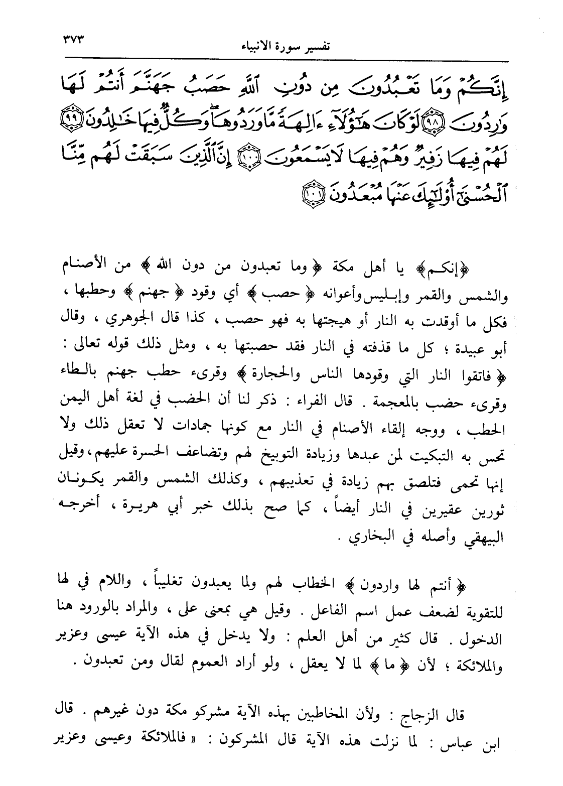إِنَّكُمْ وَمَا تَعْبُدُونَ مِنْ دُونِ اللَّهِ حَصَبُ جَهَنَّمَ أَنْتُمْ لَهَا وَارِدُونَ (98) لَوْ كَانَ هَؤُلَاءِ آلِهَةً مَا وَرَدُوهَا وَكُلٌّ فِيهَا خَالِدُونَ (99) لَهُمْ فِيهَا زَفِيرٌ وَهُمْ فِيهَا لَا يَسْمَعُونَ (100) إِنَّ الَّذِينَ سَبَقَتْ لَهُمْ مِنَّا الْحُسْنَى أُولَئِكَ عَنْهَا مُبْعَدُونَ (101)