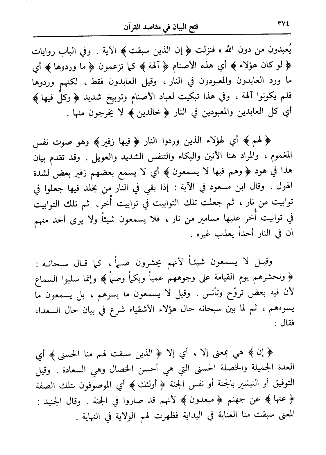 وقيل لا يسمعون شيئاً لأنهم يحشرون صماً، كما قال سبحانه: (ونحشرهم يوم القيامة على وجوههم عمياً وبكماً وصماً) وإنما سلبوا السماع لأن فيه بعض تروّح وتأنس. وقيل لا يسمعون ما يسرهم، بل يسمعون ما يسوءهم، ثم لما بين سبحانه حال هؤلاء الأشقياء شرع في بيان حال السعداء فقال: