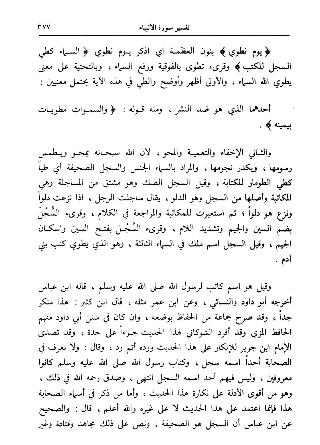 وقيل هو اسم كاتب لرسول الله صلى الله عليه وسلم، قاله ابن عباس أخرجه أبو داود والنسائي، وعن ابن عمر مثله، قال ابن كثير: هذا منكر جداً، وقد صرح جماعة من الحفاظ بوضعه، وإن كان في سنن أبي داود منهم الحافظ المزي وقد أفرد الشوكاني لهذا الحديث جزءاً على حده، وقد تصدى الإمام ابن جرير للإنكار على هذا الحديث ورده أتم رد، وقال: ولا نعرف في الصحابة أحداً اسمه سجل، وكتاب رسول الله صلى الله عليه وسلم كانوا معروفين، وليس فيهم أحد اسمه السجل انتهى، وصدق رحمه الله في ذلك، وهو من أقوى الأدلة على نكارة هذا الحديث، وأما من ذكر في أسماء الصحابة هذا فإنما اعتمد على هذا الحديث لا على غيره والله أعلم، قال: والصحيح عن ابن عباس أن السجل هو الصحيفة، ونص على ذلك مجاهد وقتادة وغير