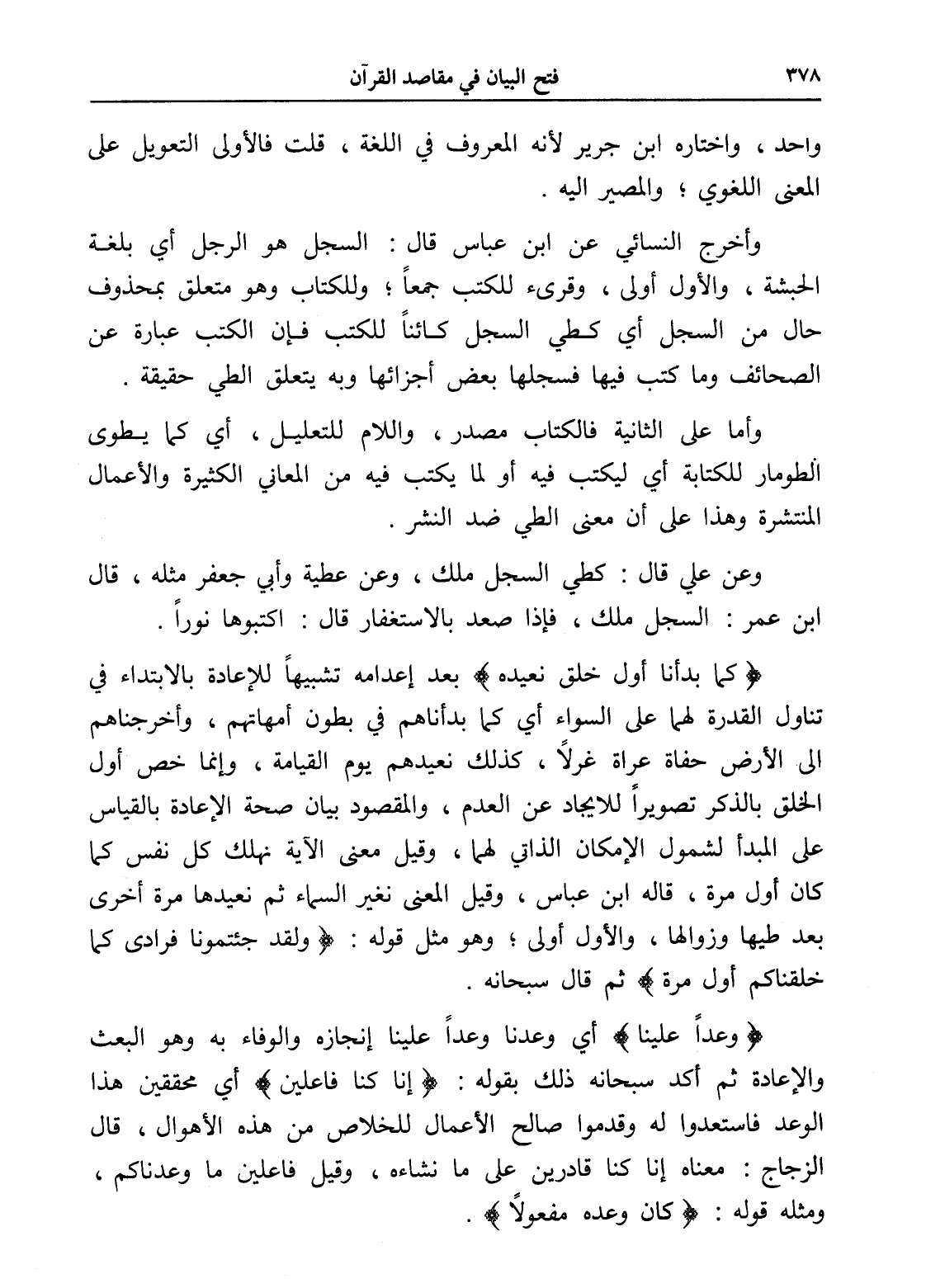 وأما على الثانية فالكتاب مصدر، واللام للتعليل، أي كما يطوى الطومار للكتابة أي ليكتب فيه أو لما يكتب فيه من المعاني الكثيرة والأعمال المنتشرة وهذا على أن معنى الطي ضد النشر.