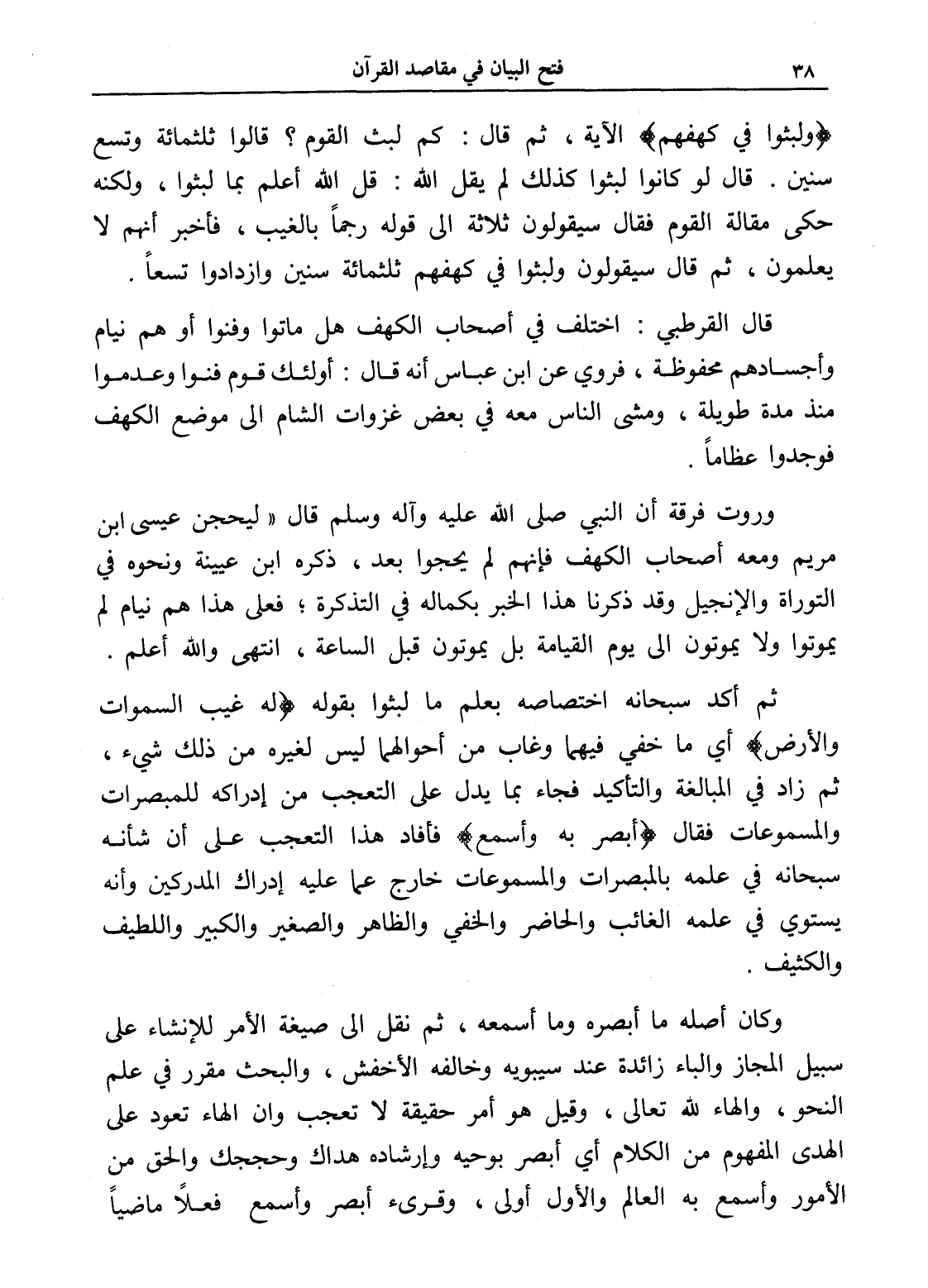 ولبثوا في كهفهم الآية، ثم قال: كم لبث القوم؟ قالوا ثلثمائة وتسع سنين. قال لو كانوا لبثوا كذلك لم يقل الله: قل الله أعلم بما لبثوا، ولكنه حكى مقالة القوم فقال سيقولون ثلاثة إلى قوله رجماً بالغيب، فأخبر أنهم لا يعلمون، ثم قال سيقولون ولبثوا في كهفهم ثلثمائة سنين وازدادوا تسعاً.