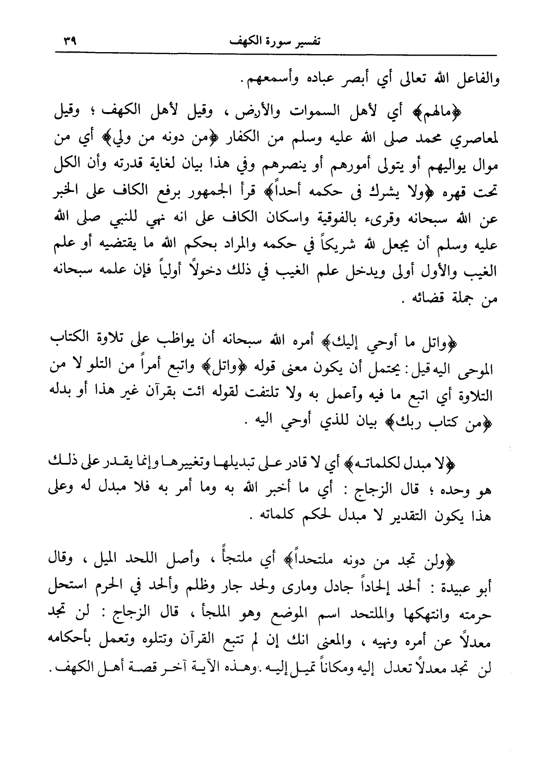 (لا مبدل لكلماته) أي لا قادر على تبديلها وتغييرها وإنما يقدر على ذلك هو وحده؛ قال الزجاج: أي ما أخبر الله به وما أمر به فلا مبدل له وعلى هذا يكون التقدير لا مبدل لحكم كلماته.