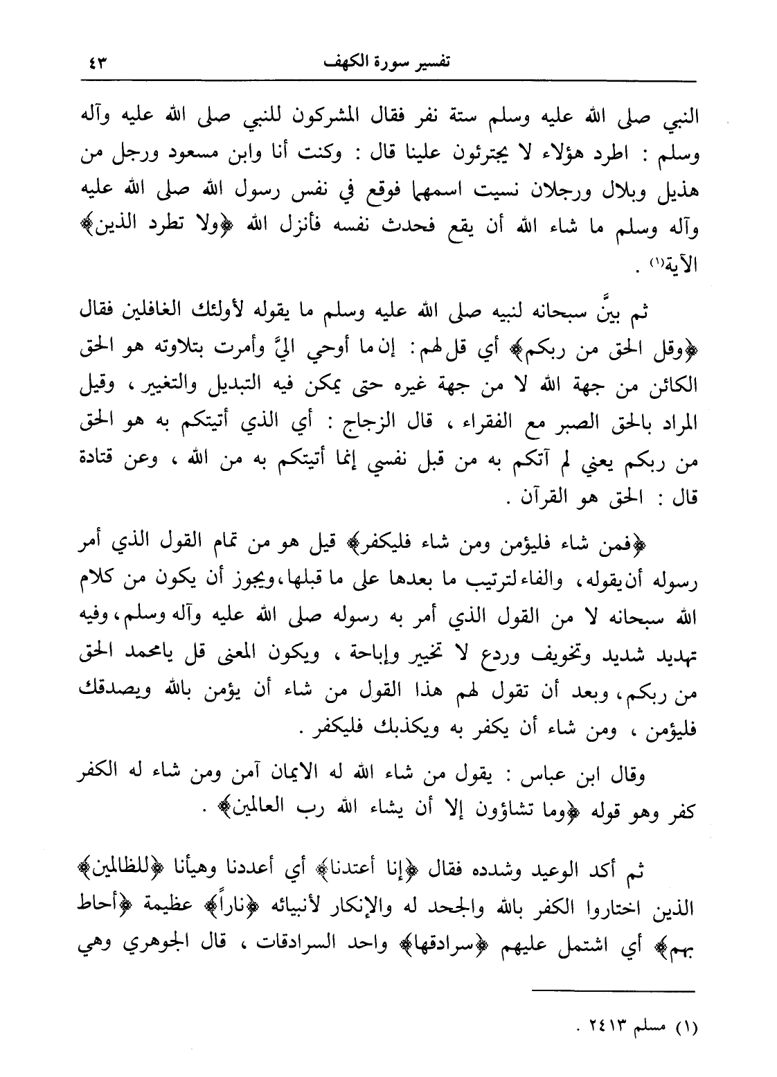 (فمن شاء فليؤمن ومن شاء فليكفر) قيل هو من تمام القول الذي أمر رسوله أن يقوله، والفاء لترتيب ما بعدها على ما قبلها، ويجوز أن يكون من كلام الله سبحانه لا من القول الذي أمر به رسوله صلى الله عليه وآله وسلم، وفيه تهديد شديد وتخويف وردع لا تخيير وإباحة، ويكون المعنى قل يا محمد الحق من ربكم، وبعد أن تقول لهم هذا القول من شاء أن يؤمن بالله ويصدقك فليؤمن، ومن شاء أن يكفر به ويكذبك فليكفر.