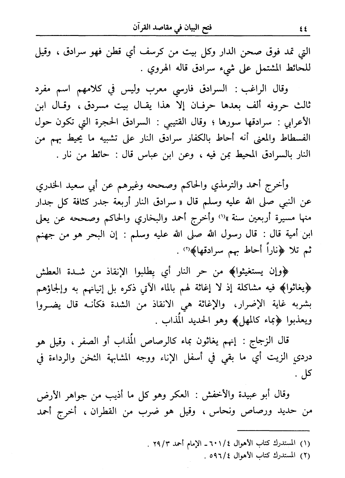 وأخرج أحمد والترمذي والحاكم وصححه وغيرهم عن أبي سعيد الخدري عن النبي صلى الله عليه وسلم قال " سرادق النار أربعة جدر كثافة كل جدار منها مسيرة أربعين سنة " (¬1) وأخرج أحمد والبخاري والحاكم وصححه عن يعلى ابن أمية قال: قال رسول الله صلى الله عليه وسلم: " إن البحر هو من جهنم ثم تلا (ناراً أحاط جهم سرادقها) " (¬2).