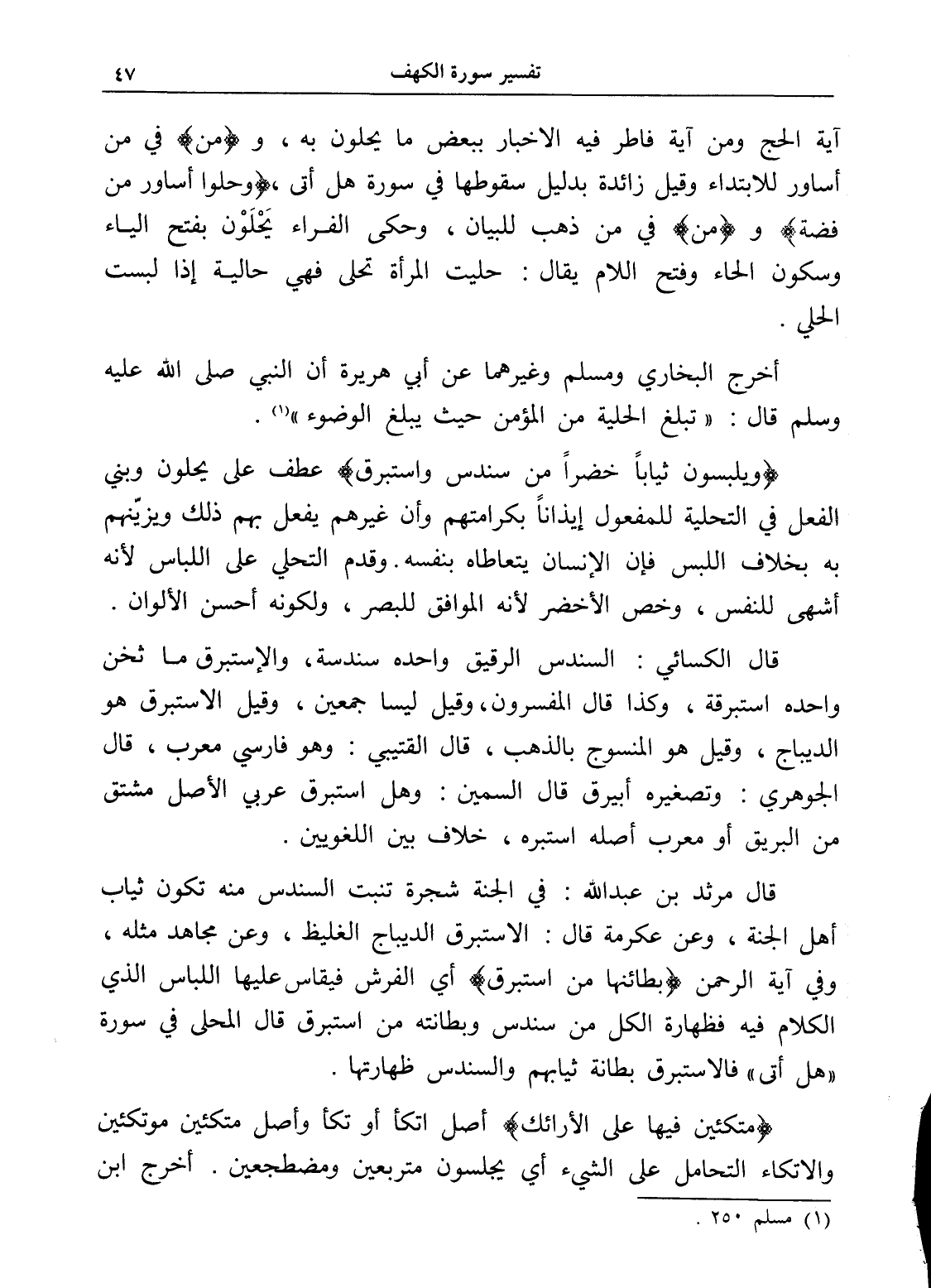 آية الحج ومن آية فاطر فيه الإخبار ببعض ما يحلون به، و (من) في من أساور للابتداء وقيل زائدة بدليل سقوطها في سورة هل أتى، (وحلوا أساور من فضة) و (من) في من ذهب للبيان، وحكى الفراء يَحْلَوْن بفتح الياء وسكون الحاء وفتح اللام يقال: حليت المرأة تحلى فهي حالية إذا لبست الحلي.