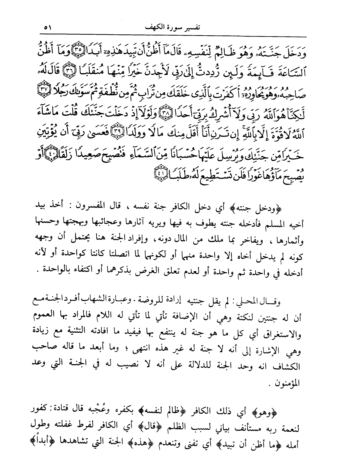 وَدَخَلَ جَنَّتَهُ وَهُوَ ظَالِمٌ لِنَفْسِهِ قَالَ مَا أَظُنُّ أَنْ تَبِيدَ هَذِهِ أَبَدًا (35) وَمَا أَظُنُّ السَّاعَةَ قَائِمَةً وَلَئِنْ رُدِدْتُ إِلَى رَبِّي لَأَجِدَنَّ خَيْرًا مِنْهَا مُنْقَلَبًا (36) قَالَ لَهُ صَاحِبُهُ وَهُوَ يُحَاوِرُهُ أَكَفَرْتَ بِالَّذِي خَلَقَكَ مِنْ تُرَابٍ ثُمَّ مِنْ نُطْفَةٍ ثُمَّ سَوَّاكَ رَجُلًا (37) لَكِنَّا هُوَ اللَّهُ رَبِّي وَلَا أُشْرِكُ بِرَبِّي أَحَدًا (38) وَلَوْلَا إِذْ دَخَلْتَ جَنَّتَكَ قُلْتَ مَا شَاءَ اللَّهُ لَا قُوَّةَ إِلَّا بِاللَّهِ إِنْ تَرَنِ أَنَا أَقَلَّ مِنْكَ مَالًا وَوَلَدًا (39) فَعَسَى رَبِّي أَنْ يُؤْتِيَنِ خَيْرًا مِنْ جَنَّتِكَ وَيُرْسِلَ عَلَيْهَا حُسْبَانًا مِنَ السَّمَاءِ فَتُصْبِحَ صَعِيدًا زَلَقًا (40) أَوْ يُصْبِحَ مَاؤُهَا غَوْرًا فَلَنْ تَسْتَطِيعَ لَهُ طَلَبًا (41)