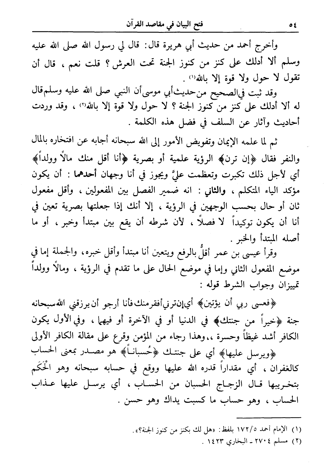 (فعسى ربي أن يؤتين) أي إن ترني أفقر منك فأنا أرجو أن يرزقني الله سبحانه جنة (خيراً من جنتك) في الدنيا أو في الآخرة أو فيهما، وفي الأول يكون الكافر أشد غيظاً وحسرة، وهذا رجاء من المؤمن وقرع على مقالة الكافر الأولى (ويرسل عليها) أي على جنتك (حُسباناً) هو مصدر بمعنى الحساب كالغفران، أي مقداراً قدره الله عليها ووقع في حسابه سبحانه وهو الْحَكَم بتخريبها قال الزجاج الحسبان من الحساب، أي يرسل عليها عذاب الحساب، وهو حساب ما كسبت يداك وهو حسن.