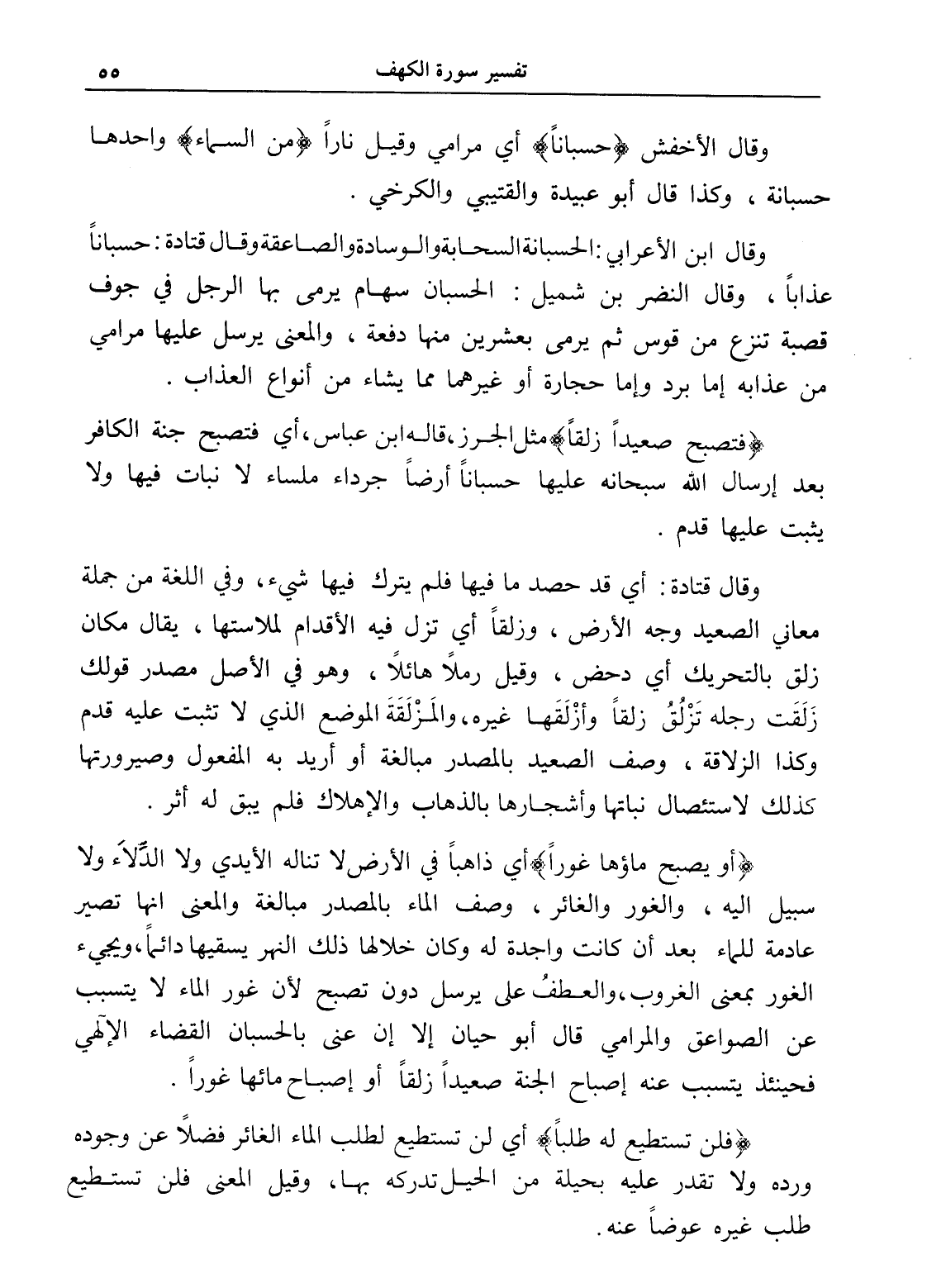 (فتصبح صعيداً زلقاً) مثل الجرز، قاله ابن عباس، أي فتصبح جنة الكافر بعد إرسال الله سبحانه عليها حسباناً أرضاً جرداء ملساء لا نبات فيها ولا يثبت عليها قدم.