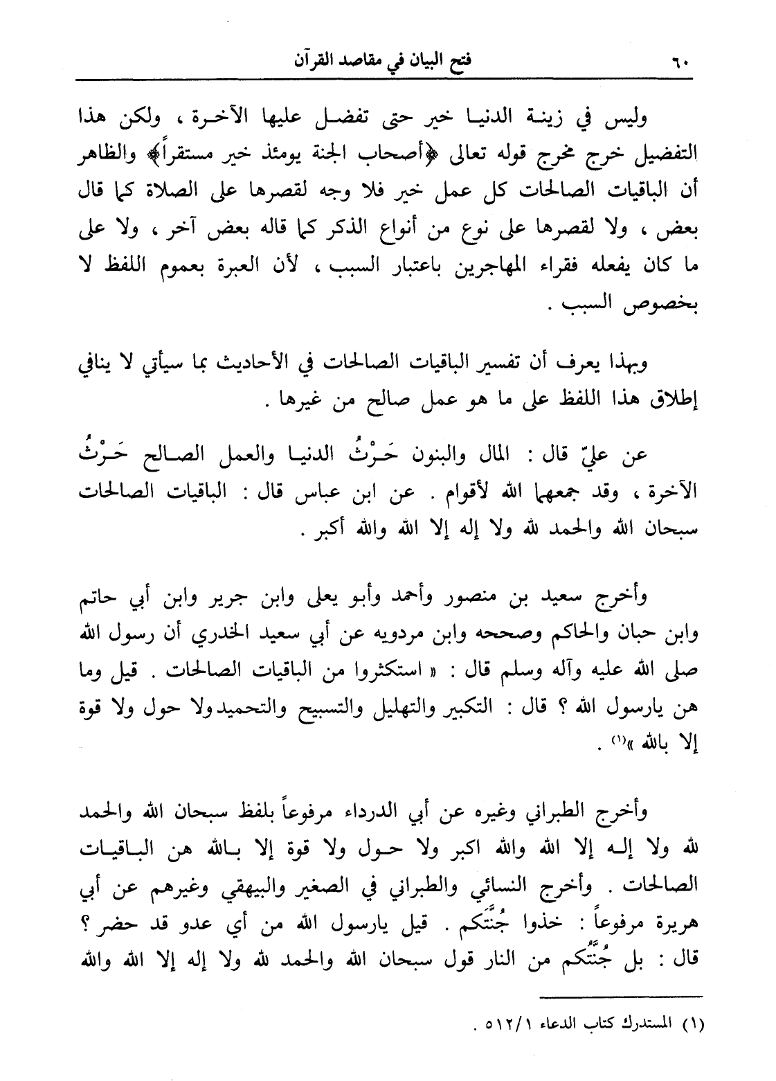 وبهذا يعرف أن تفسير الباقيات الصالحات في الأحاديث بما سيأتي لا ينافي إطلاق هذا اللفظ على ما هو عمل صالح من غيرها.