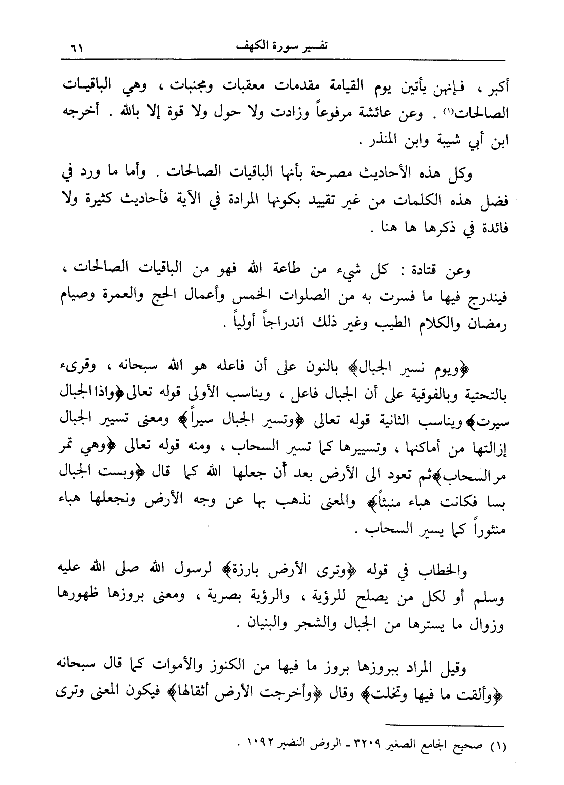 وكل هذه الأحاديث مصرحة بأنها الباقيات الصالحات. وأما ما ورد في فضل هذه الكلمات من غير تقييد بكونها المرادة في الآية فأحاديث كثيرة ولا فائدة في ذكرها هاهنا.