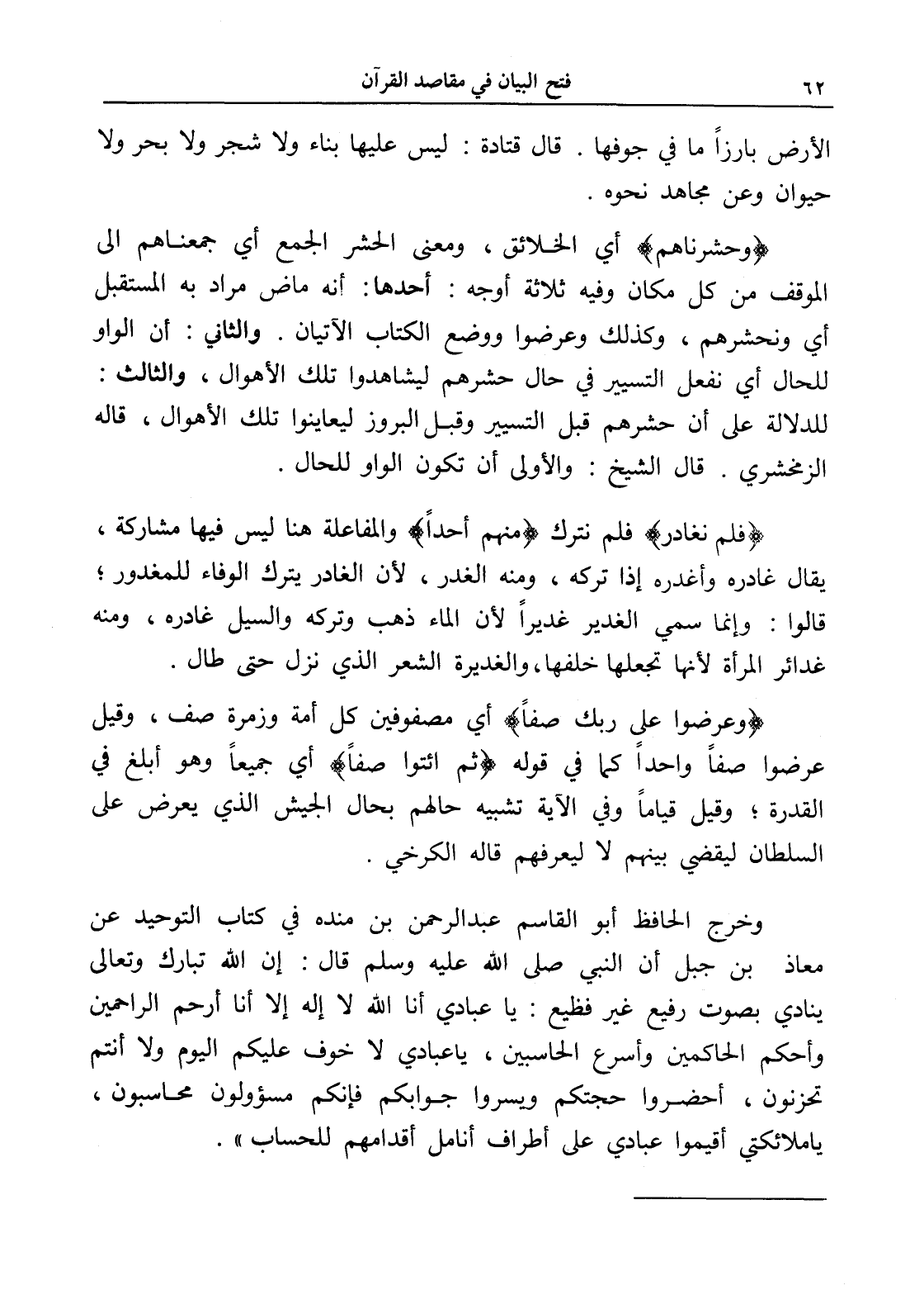 (وحشرناهم) أي الخلائق، ومعنى الحشر الجمع أي جمعناهم إلى الموقف من كل مكان وفيه ثلاثة أوجه: أحدها: أنه ماض مراد به المستقبل أي ونحشرهم، وكذلك وعرضوا ووضع الكتاب الآتيان. والثاني: أن الواو للحال أي نفعل التسيير في حال حشرهم ليشاهدوا تلك الأهوال، والثالث: للدلالة على أن حشرهم قبل التسيير وقبل البروز ليعاينوا تلك الأهوال، قاله الزمخشري. قال الشيخ: والأولى أن تكون الواو للحال.