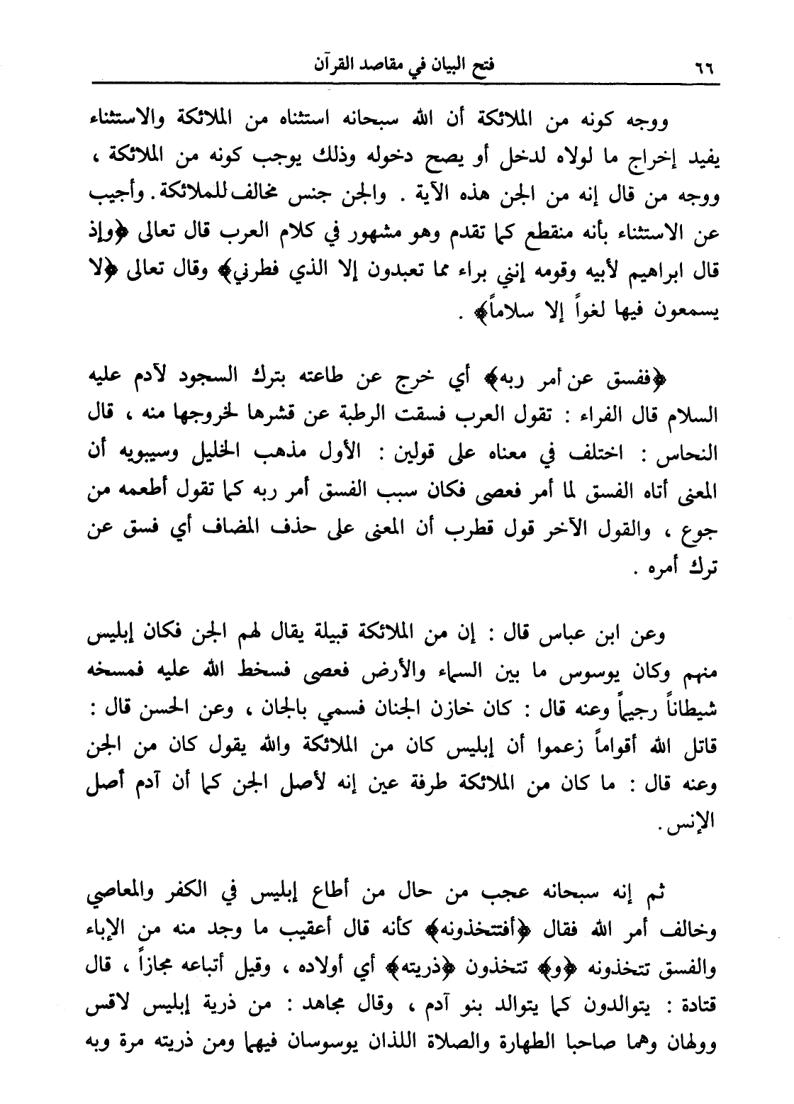 ووجه كونه من الملائكة أن الله سبحانه استثناه من الملائكة والاستثناء يفيد إخراج ما لولاه لدخل أو يصح دخوله وذلك يوجب كونه من الملائكة، ووجه من قال إنه من الجن هذه الآية. والجن جنس مخالف للملائكة. وأجيب عن الاستثناء بأنه منقطع كما تقدم وهو مشهور في كلام العرب قال تعالى (وإذ قال إبراهيم لأبيه وقومه إنني براء مما تعبدون إلا الذي فطرني) وقال تعالى (لا يسمعون فيها لغواً إلا سلاماً).