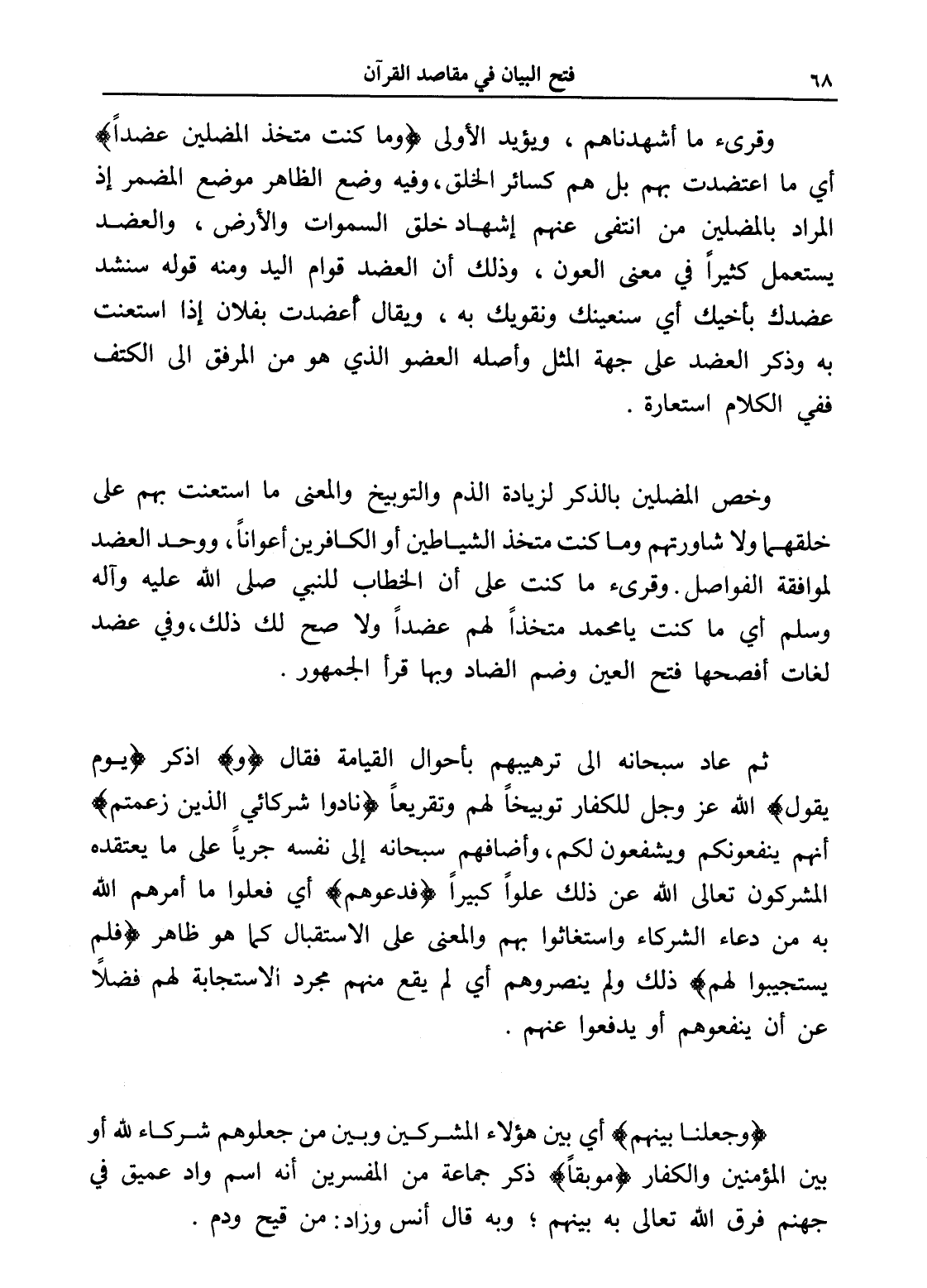 وخص المضلين بالذكر لزيادة الذم والتوبيخ والمعنى ما استعنت بهم على خلقهما ولا شاورتهم وما كنت متخذ الشياطين أو الكافرين أعواناً، ووحد العضد لموافقة الفواصل. وقرئ ما كنت على أن الخطاب للنبي صلى الله عليه وآله وسلم أي ما كنت يا محمد متخذاً لهم عضداً ولا صح لك ذلك، وفي عضد لغات أفصحها فتح العين وضم الضاد وبها قرأ الجمهور.