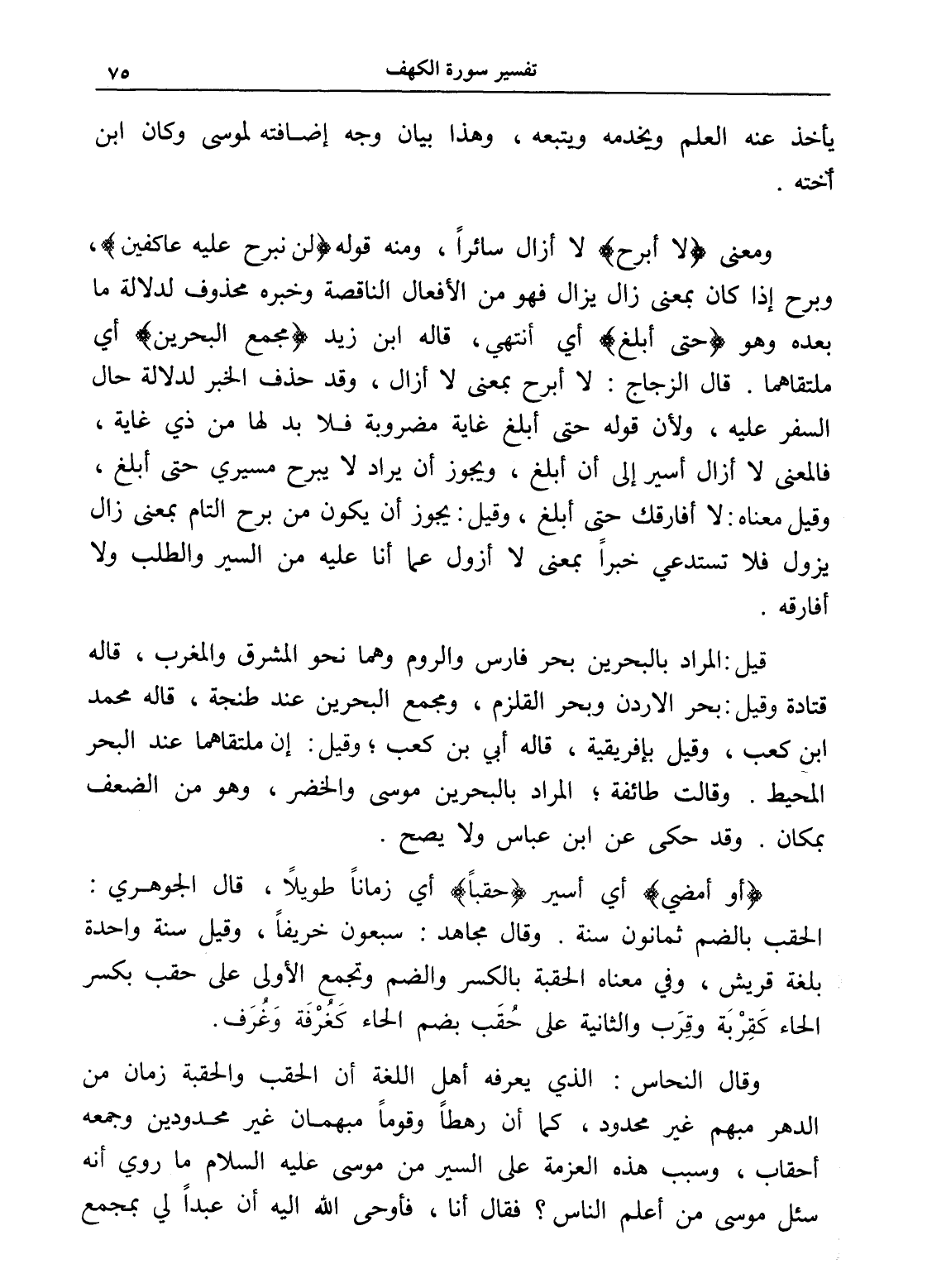 وقال النحاس: الذي يعرفه أهل اللغة أن الحقب والحقبة زمان من الدهر مبهم غير محدود، كما أن رهطاً وقوماً مبهمان غير محدودين وجمعه أحقاب، وسبب هذه العزمة على السير من موسى عليه السلام ما روي أنه سئل موسى من أعلم الناس؛ فقال أنا، فأوحى الله إليه أن عبداً لي بمجمع