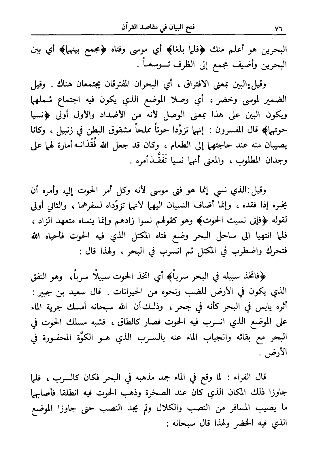 وقيل: البين بمعنى الافتراق، أي البحران المفترقان يجتمعان هناك. وقيل الضمير لموسى وخضر، أي وصلا الموضع الذي يكون فيه اجتماع شملهما ويكون البين على هذا بمعنى الوصل لأنه من الأضداد والأول أولى (نسيا حوتهما) قال المفسرون: إنهما تزوَّدا حوتاً مملحاً مشقوق البطن في زنبيل، وكانا يصيبان منه عند حاجتهما إلى الطعام، وكان قد جعل الله فقْدَانه أمارة لهما على وجدان المطلوب، والمعنى أنهما نسيا تَفَقُّدَ أمره.
