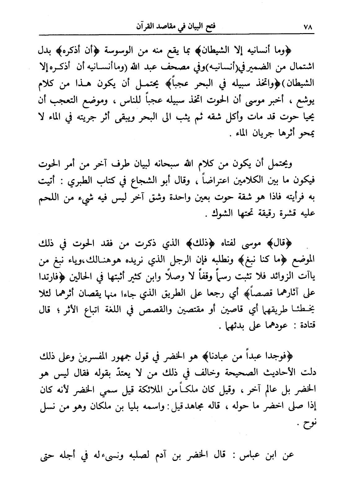 (فوجدا عبداً من عبادنا) هو الخضر في قول جمهور المفسرين وعلى ذلك دلت الأحاديث الصحيحة وخالف في ذلك من لا يعتدّ بقوله فقال ليس هو الخضر بل عالم آخر، وقيل كان ملكاً من الملائكة قيل سمي الخضر لأنه كان إذا صلى اخضر ما حوله، قاله مجاهد قيل: واسمه بليا بن ملكان وهو من نسل نوح.