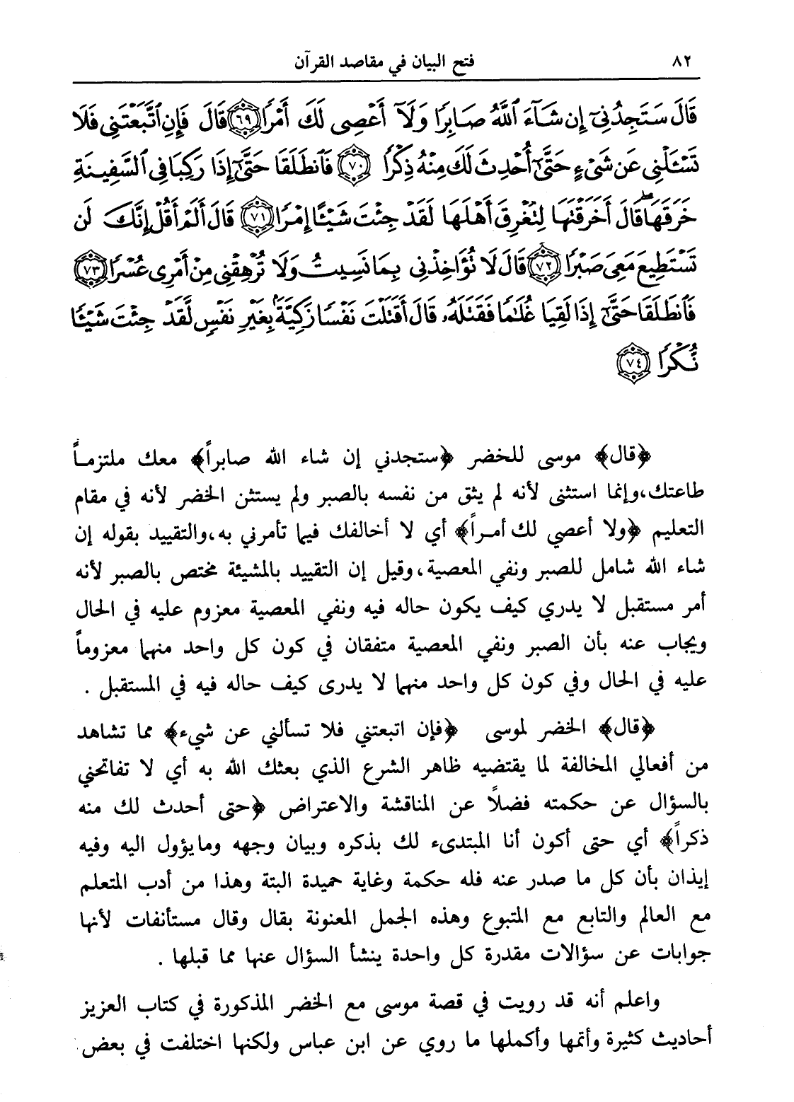 قَالَ سَتَجِدُنِي إِنْ شَاءَ اللَّهُ صَابِرًا وَلَا أَعْصِي لَكَ أَمْرًا (69) قَالَ فَإِنِ اتَّبَعْتَنِي فَلَا تَسْأَلْنِي عَنْ شَيْءٍ حَتَّى أُحْدِثَ لَكَ مِنْهُ ذِكْرًا (70) فَانْطَلَقَا حَتَّى إِذَا رَكِبَا فِي السَّفِينَةِ خَرَقَهَا قَالَ أَخَرَقْتَهَا لِتُغْرِقَ أَهْلَهَا لَقَدْ جِئْتَ شَيْئًا إِمْرًا (71) قَالَ أَلَمْ أَقُلْ إِنَّكَ لَنْ تَسْتَطِيعَ مَعِيَ صَبْرًا (72) قَالَ لَا تُؤَاخِذْنِي بِمَا نَسِيتُ وَلَا تُرْهِقْنِي مِنْ أَمْرِي عُسْرًا (73) فَانْطَلَقَا حَتَّى إِذَا لَقِيَا غُلَامًا فَقَتَلَهُ قَالَ أَقَتَلْتَ نَفْسًا زَكِيَّةً بِغَيْرِ نَفْسٍ لَقَدْ جِئْتَ شَيْئًا نُكْرًا (74)