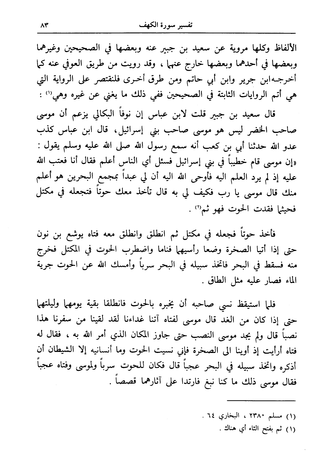 قال سعيد بن جبير قلت لابن عباس إن نوفاً البكالي يزعم أن موسى صاحب الخضر ليس هو موسى صاحب بني إسرائيل، قال ابن عباس كذب عدو الله حدثنا أبي بن كعب أنه سمع رسول الله صلى الله عليه وسلم يقول: " إن موسى قام خطيباً في بني إسرائيل فسئل أي الناس أعلم فقال أنا فعتب الله عليه إذ لم يرد العلم إليه فأوحى الله إليه أن لي عبداً بمجمع البحرين هو أعلم منك قال موسى يا رب فكيف لي به قال تأخذ معك حوتاً فتجعله في مكتل فحيثما فقدت الحوت فهو ثم (¬2).