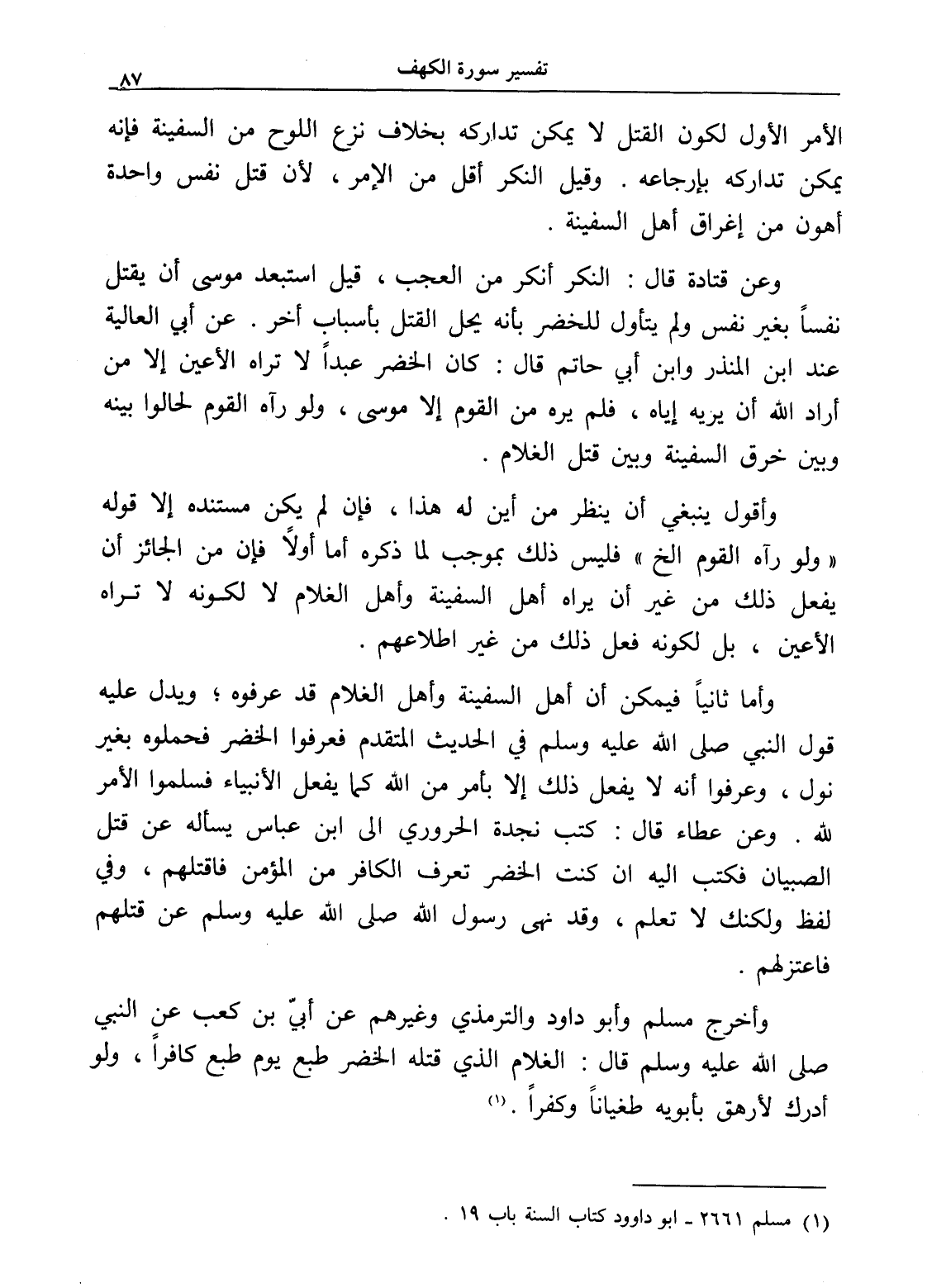 وأما ثانياً فيمكن أن أهل السفينة وأهل الغلام قد عرفوه؛ ويدل عليه قول النبي صلى الله عليه وسلم في الحديث المتقدم فعرفوا الخضر فحملوه بغير نول، وعرفوا أنه لا يفعل ذلك إلا بأمر من الله كما يفعل الأنبياء فسلموا الأمر لله. وعن عطاء قال: كتب نجدة الحروري إلى ابن عباس يسأله عن قتل الصبيان فكتب إليه إن كنت الخضر تعرف الكافر من المؤمن فاقتلهم، وفي لفظ ولكنك لا تعلم، وقد نهى رسول الله صلى الله عليه وسلم عن قتلهم فاعتزلهم.