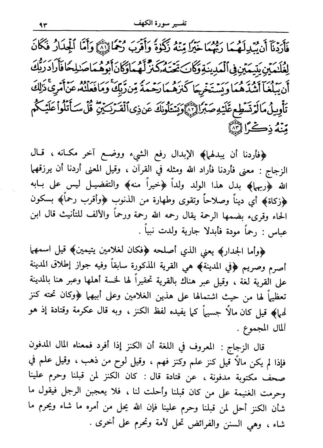 فَأَرَدْنَا أَنْ يُبْدِلَهُمَا رَبُّهُمَا خَيْرًا مِنْهُ زَكَاةً وَأَقْرَبَ رُحْمًا (81) وَأَمَّا الْجِدَارُ فَكَانَ لِغُلَامَيْنِ يَتِيمَيْنِ فِي الْمَدِينَةِ وَكَانَ تَحْتَهُ كَنْزٌ لَهُمَا وَكَانَ أَبُوهُمَا صَالِحًا فَأَرَادَ رَبُّكَ أَنْ يَبْلُغَا أَشُدَّهُمَا وَيَسْتَخْرِجَا كَنْزَهُمَا رَحْمَةً مِنْ رَبِّكَ وَمَا فَعَلْتُهُ عَنْ أَمْرِي ذَلِكَ تَأْوِيلُ مَا لَمْ تَسْطِعْ عَلَيْهِ صَبْرًا (82) وَيَسْأَلُونَكَ عَنْ ذِي الْقَرْنَيْنِ قُلْ سَأَتْلُو عَلَيْكُمْ مِنْهُ ذِكْرًا (83)