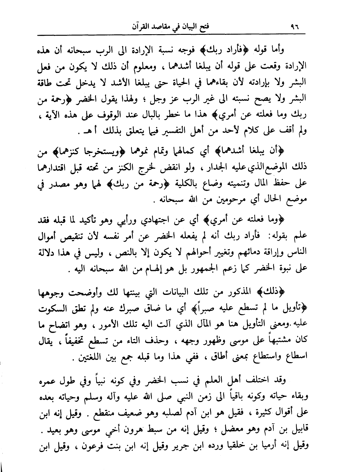 (وما فعلته عن أمري) أي عن اجتهادي ورأيي وهو تأكيد لما قبله فقد علم بقوله: فأراد ربك أنه لم يفعله الخضر عن أمر نفسه لأن تنقيص أموال الناس وإراقة دمائهم وتغيير أحوالهم لا يكون إلا بالنص، وليس في هذا دلالة على نبوة الخضر كما زعم الجمهور بل هو إلهام من الله سبحانه إليه.