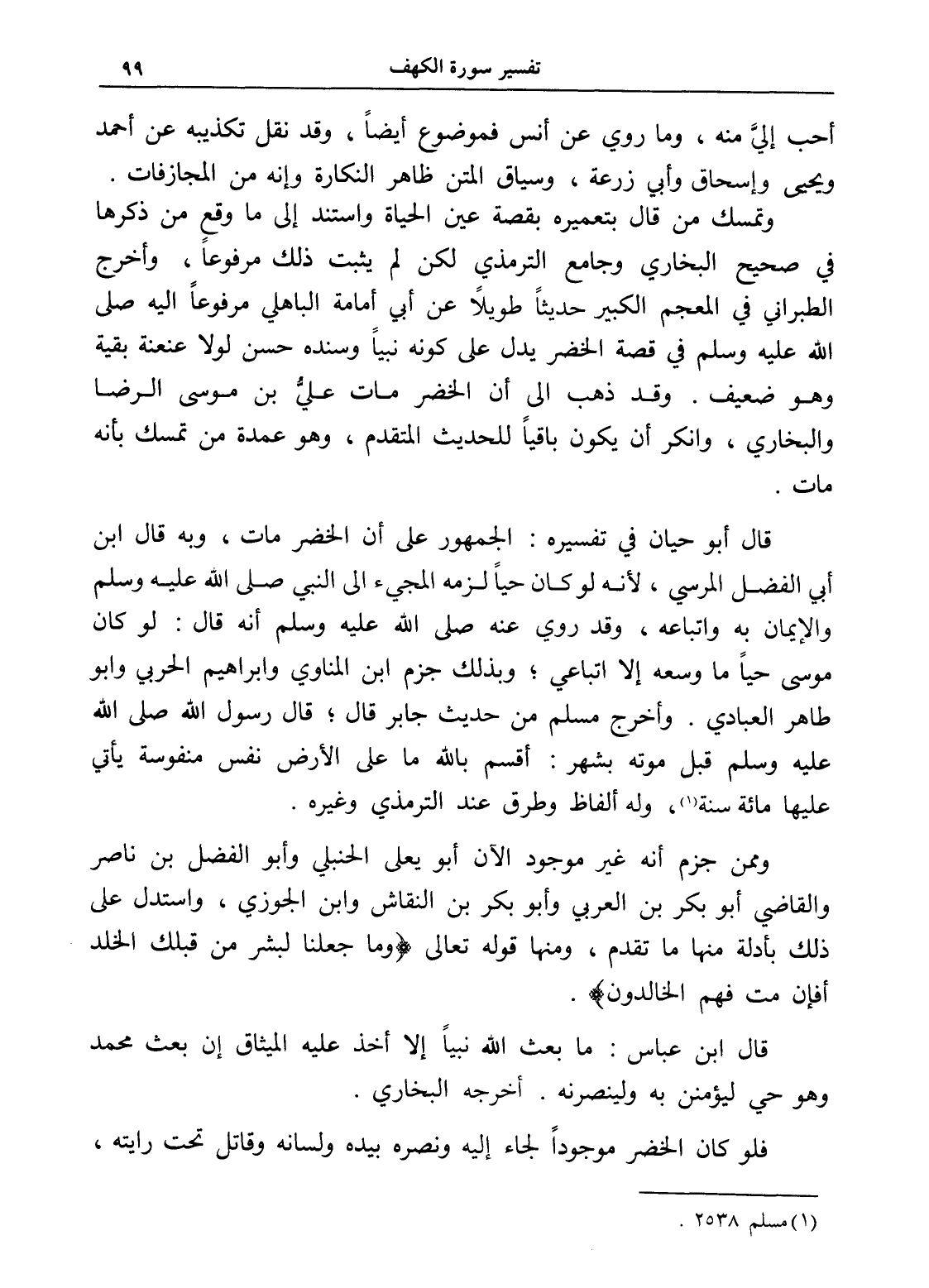 قال أبو حيان في تفسيره: الجمهور على أن الخضر مات، وبه قال ابن أبي الفضل المرسي، لأنه لو كان حياً لزمه المجيء إلى النبي صلى الله عليه وسلم والإيمان به واتباعه، وقد روي عنه صلى الله عليه وسلم أنه قال: لو كان موسى حياً ما وسعه إلا اتباعي؛ وبذلك جزم ابن المناوي وإبراهيم الحربي وأبو طاهر العبادي. وأخرج مسلم من حديث جابر قال؛ قال رسول الله صلى الله عليه وسلم قبل موته بشهر: " أقسم بالله ما على الأرض نفس منفوسة يأتي عليها مائة سنة " (¬1)، وله ألفاظ وطرق عند الترمذي وغيره.