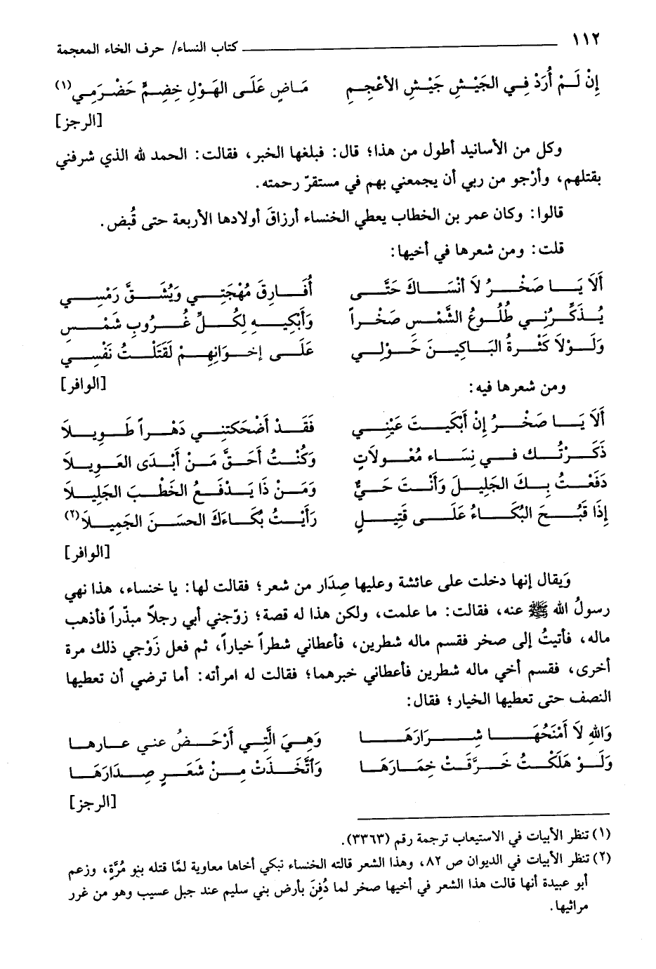 [الوافر] ويقال إنها دخلت على عائشة وعليها صدار من شعر، فقالت لها: يا خنساء، هذا نهي رسول اللَّه صلّى اللَّه عليه وسلّم عنه، فقالت: ما علمت، ولكن هذا له قصة، زوّجني أبي رجلا مبذّرا فأذهب ماله، فأتيت إلى صخر فقسم ماله شطرين، فأعطاني شطرا خيارا، ثم فعل زوجي ذلك مرة أخرى، فقسم أخي ماله شطرين فأعطاني خبرهما، فقالت له امرأته: أما ترضي أن تعطيها النصف حتى تعطيها الخيار، فقال: