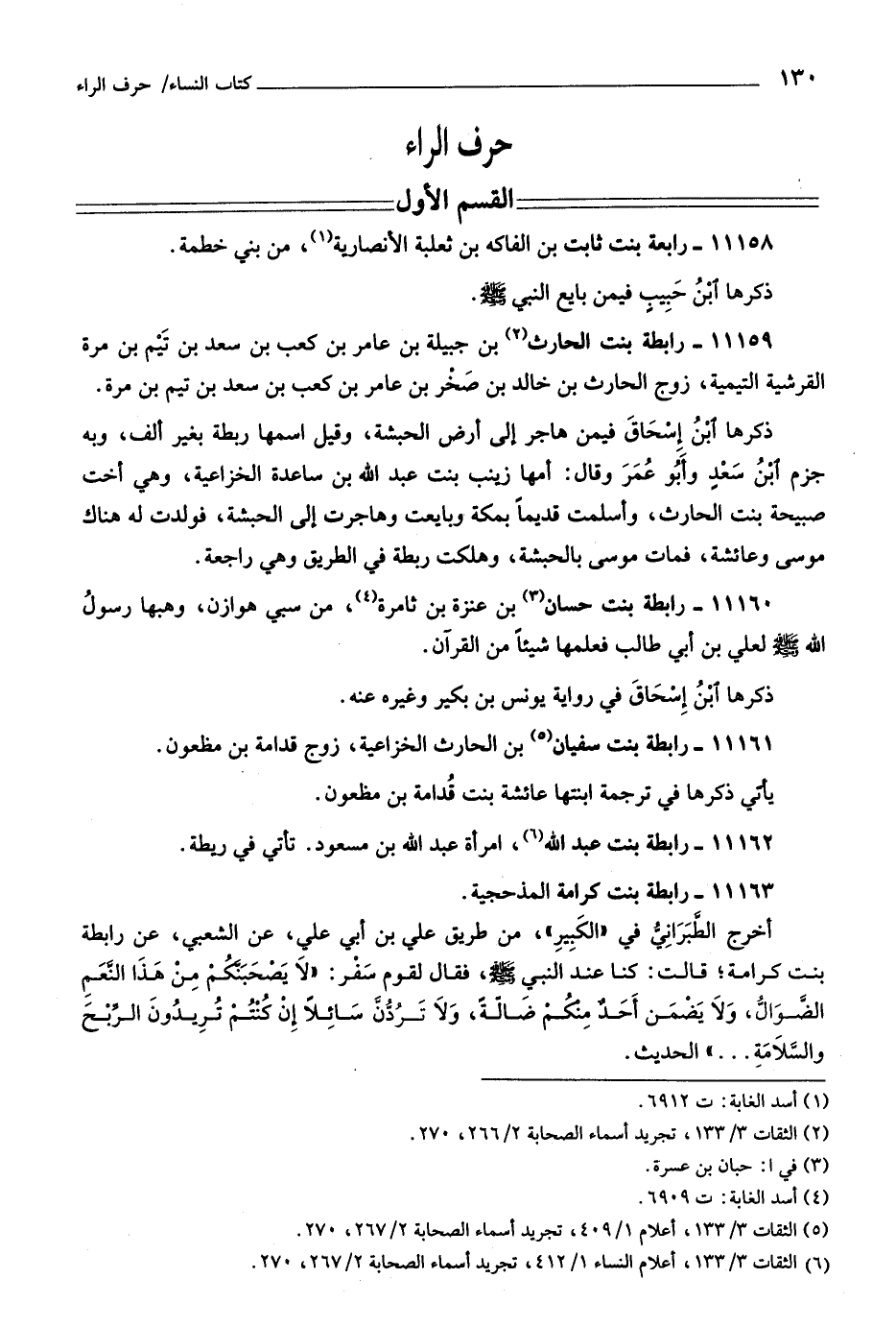 (٦) الثقات ٣/ ١٣٣، أعلام النساء ١/ ٤١٢، تجريد أسماء الصحابة ٢/ ٢٦٧، ٢٧٠.