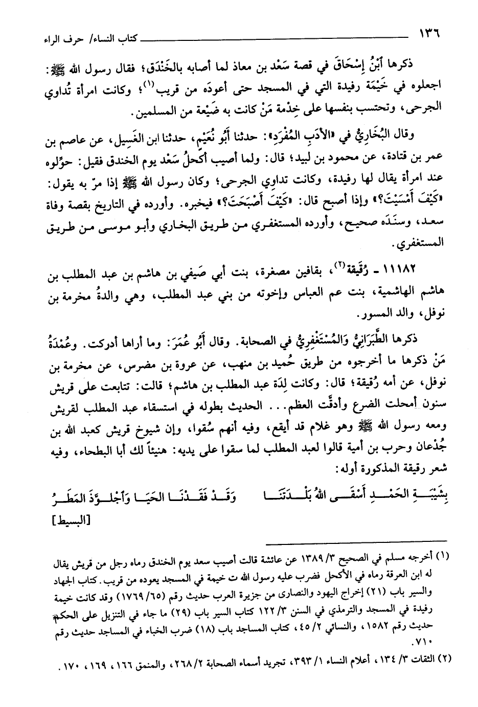وقال البخاريّ في «الأدب المفرد» : حدثنا أبو نعيم، حدثنا ابن الغسيل، عن عاصم بن عمر بن قتادة، عن محمود بن لبيد، قال: ولما أصيب أكحل سعد يوم الخندق فقيل: حوّلوه عند امرأة يقال لها رفيدة، وكانت تداوي الجرحى، وكان رسول اللَّه صلّى اللَّه عليه وسلّم إذا مرّ به يقول: