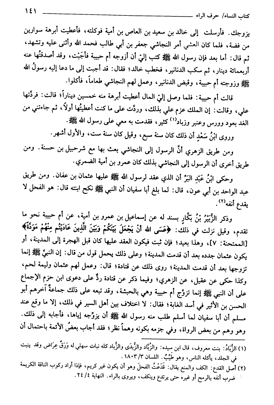 قالت أم حبيبة: فلما وصل إليّ المال أعطيت أبرهة منه خمسين دينارا، قالت: فردّتها علي، وقالت: إن الملك عزم علي بذلك، وردّت على ما كنت أعطيتها أولا، ثم جاءتني من الغد بعود وورس وعنبر وزباد «١» كثير، فقدمت به معي على رسول اللَّه صلّى اللَّه عليه وسلّم.