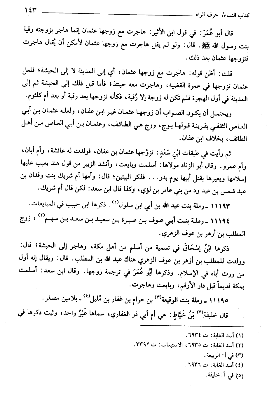 قال أبو عمر: في قول ابن الأثير: هاجرت مع زوجها عثمان إنما هاجر بزوجته رقية بنت رسول اللَّه صلّى اللَّه عليه وسلّم. قال: ولو لم يقل هاجرت مع زوجها عثمان لأمكن أن يقال هاجرت فتزوجها عثمان بعد ذلك.