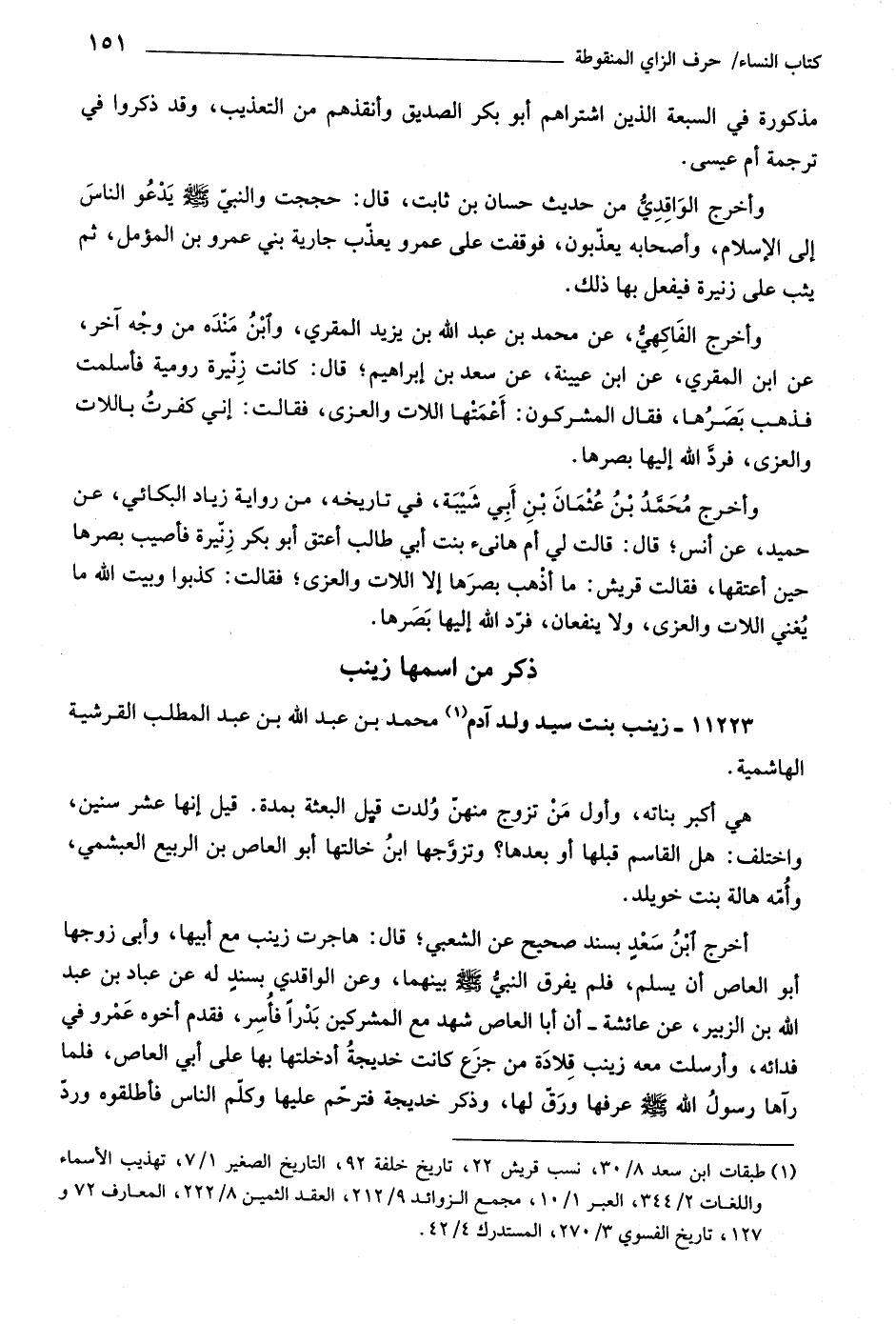 (١) طبقات ابن سعد ٨/ ٣٠، نسب قريش ٢٢، تاريخ خلفة ٩٢، التاريخ الصغير ١/ ٧، تهذيب الأسماء واللغات ٢/ ٣٤٤، العبر ١/ ١٠، مجمع الزوائد ٩/ ٢١٢، العقد الثمين ٨/ ٢٢٢، المعارف ٧٢ و ١٢٧، تاريخ الفسوي ٣/ ٢٧٠، المستدرك ٤/ ٤٢.